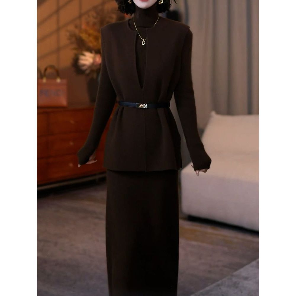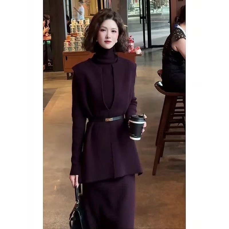 气质高级裙套装女秋冬新款洋气针织打底衫针织马甲半裙三件套8464