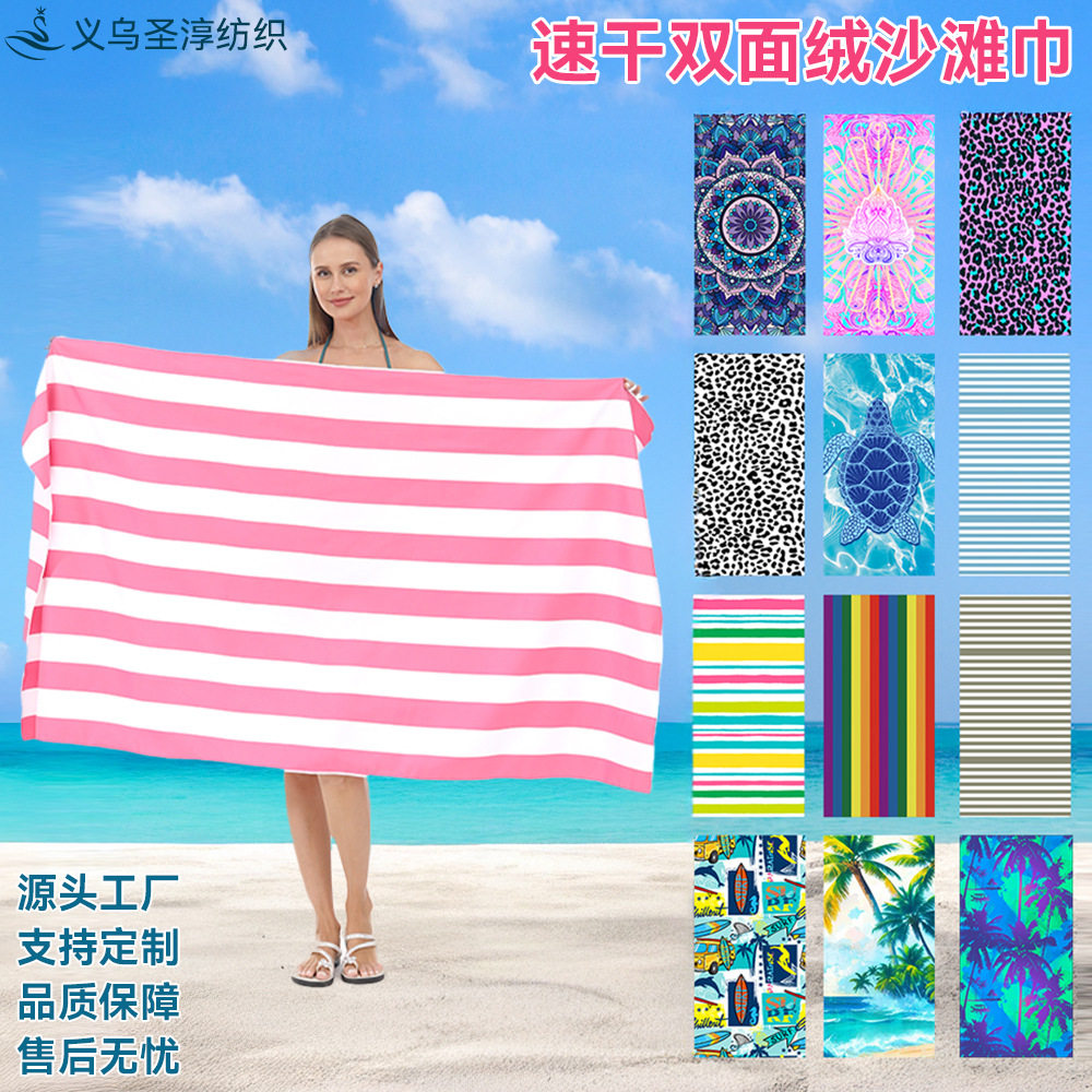 跨境专供双面绒速干沙滩巾 成人印花条纹大浴巾海边游泳披肩毛巾