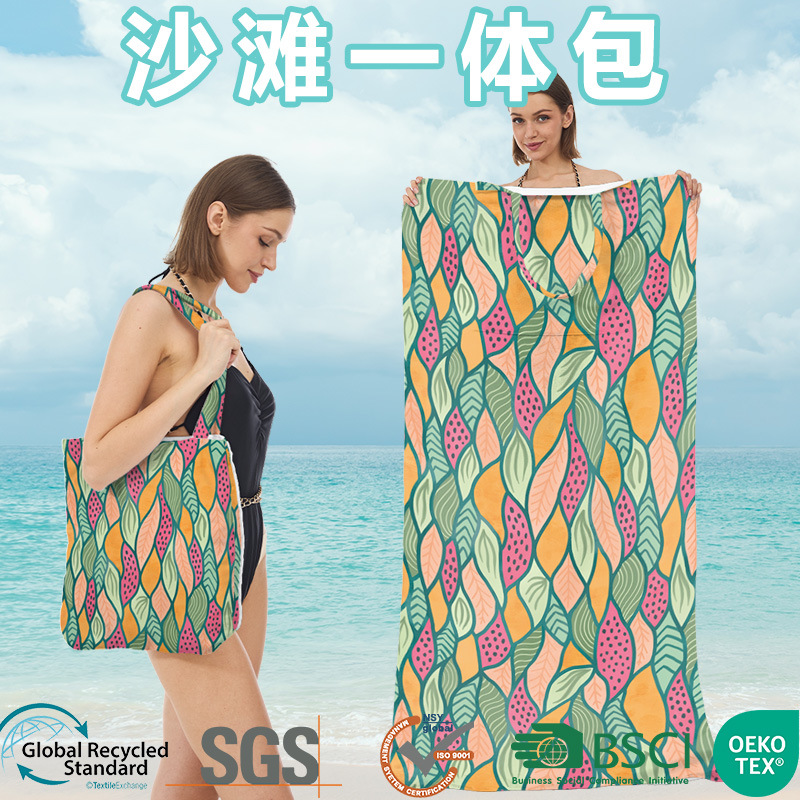 吸水性抜群の人気商品、2in1ビーチタオル。持ち運びに便利な一体型収納付き、超極細繊維プリントビーチタオル。