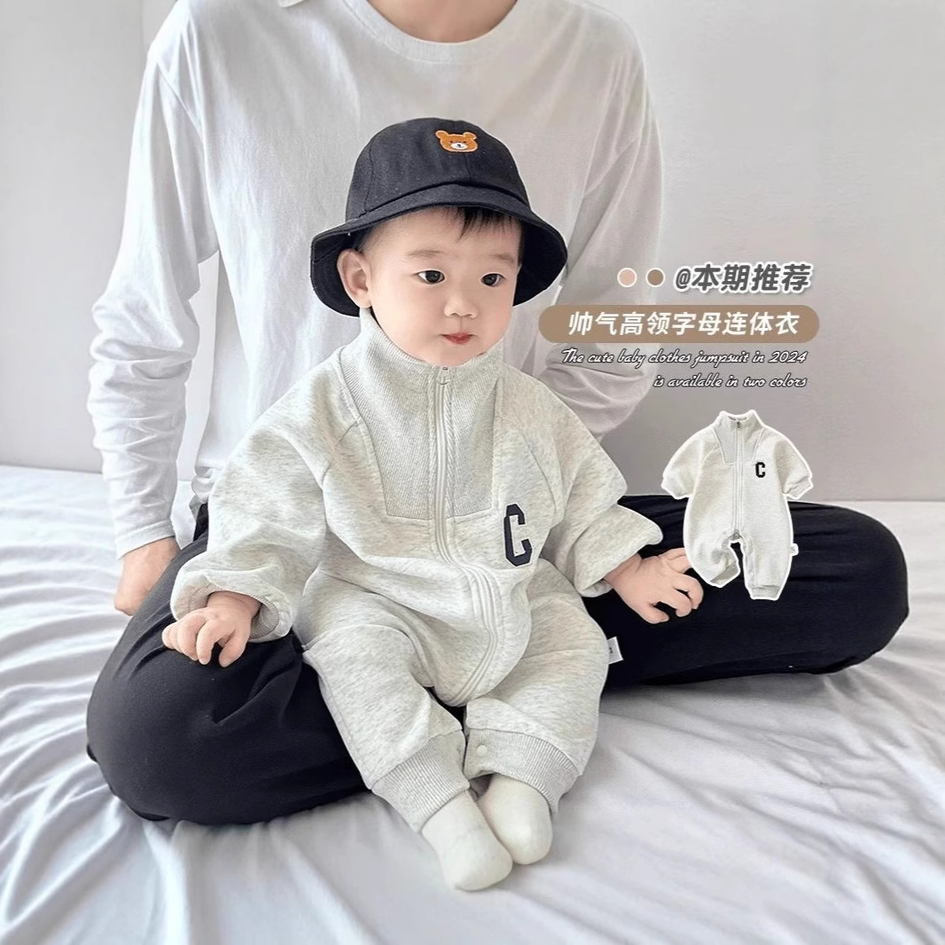 春秋婴儿韩版拉链C标长袖连体衣男女宝宝外出哈衣爬爬服连体衣潮