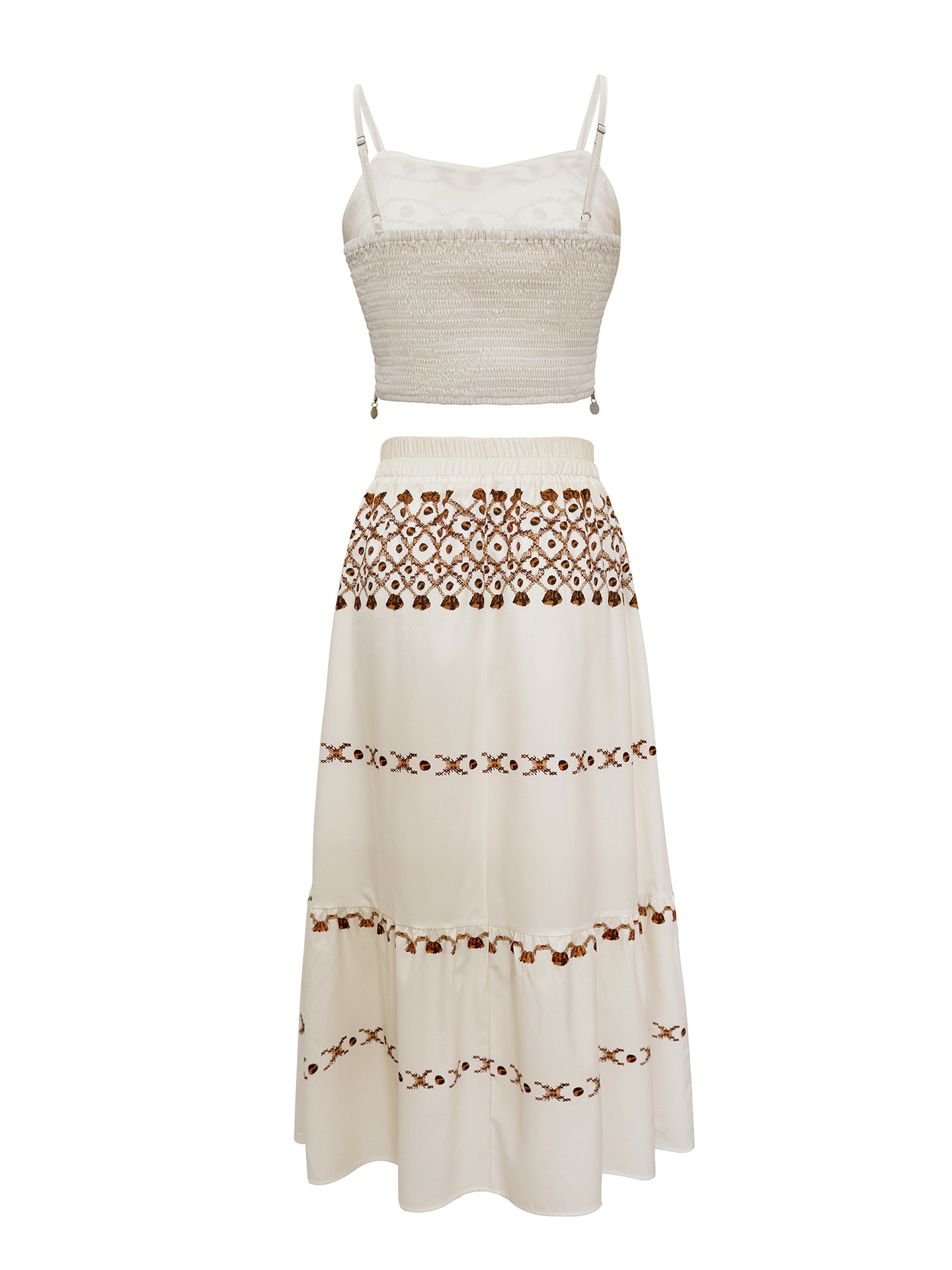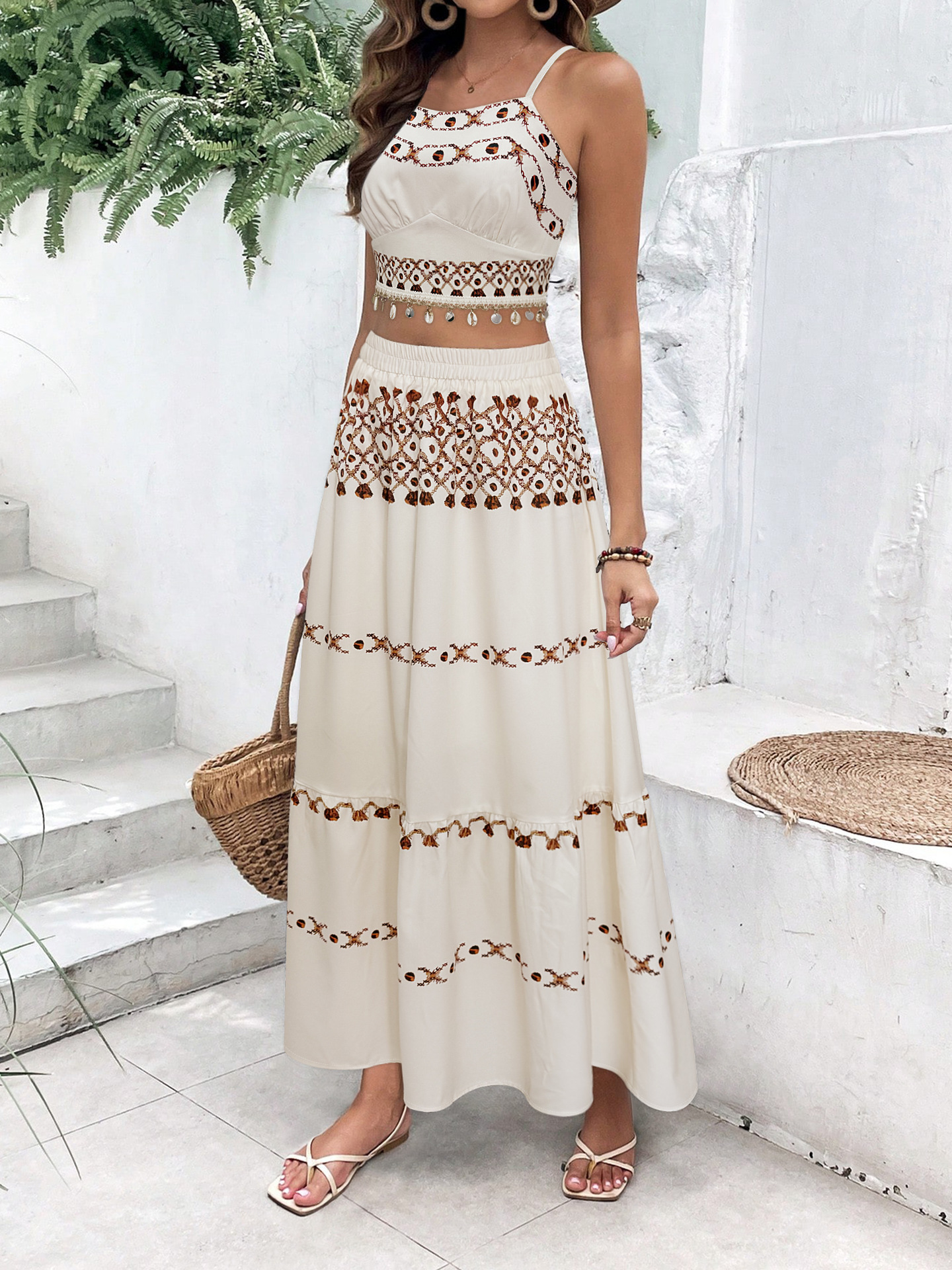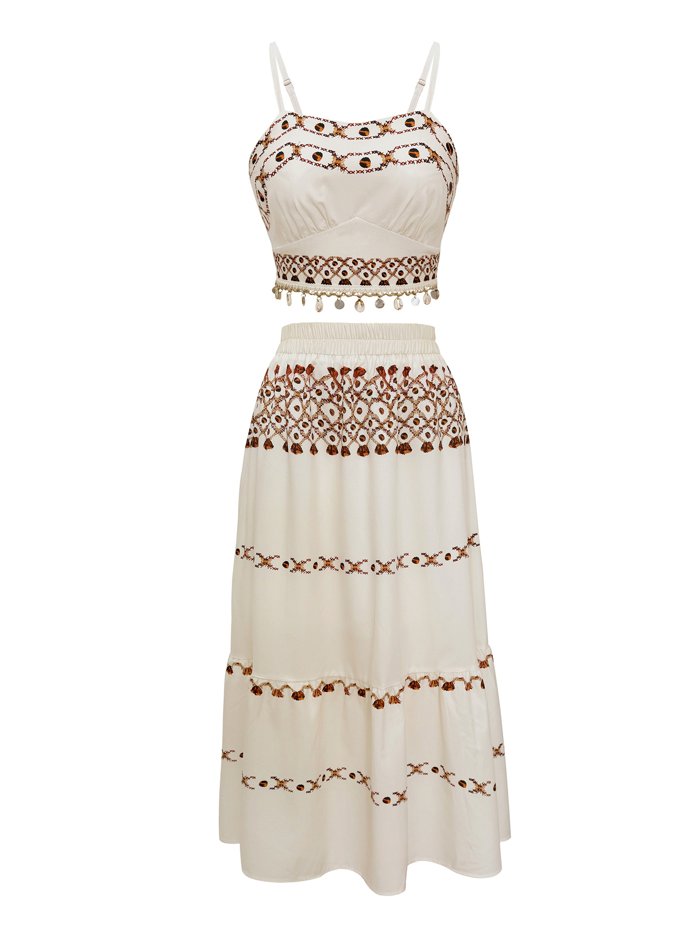 ボヘミアンリゾートポジショニングプリントビーチレディースセットフリンジ織りストラップトップハーフスカート2点セット