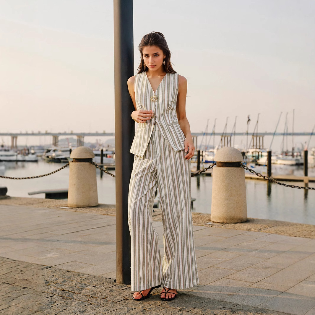 欧米の越境女性スーツの夏のストライプの袖なしの上着のゆったりとした広い足の長いズボンの2つのセットの優雅な通勤