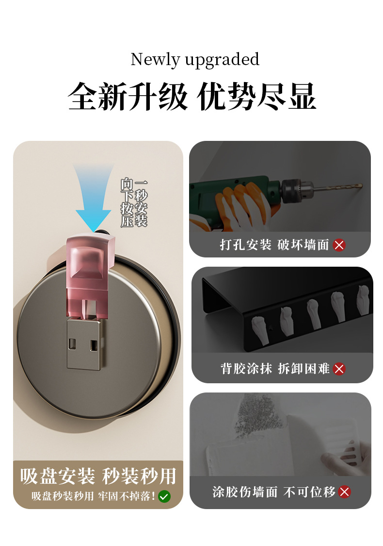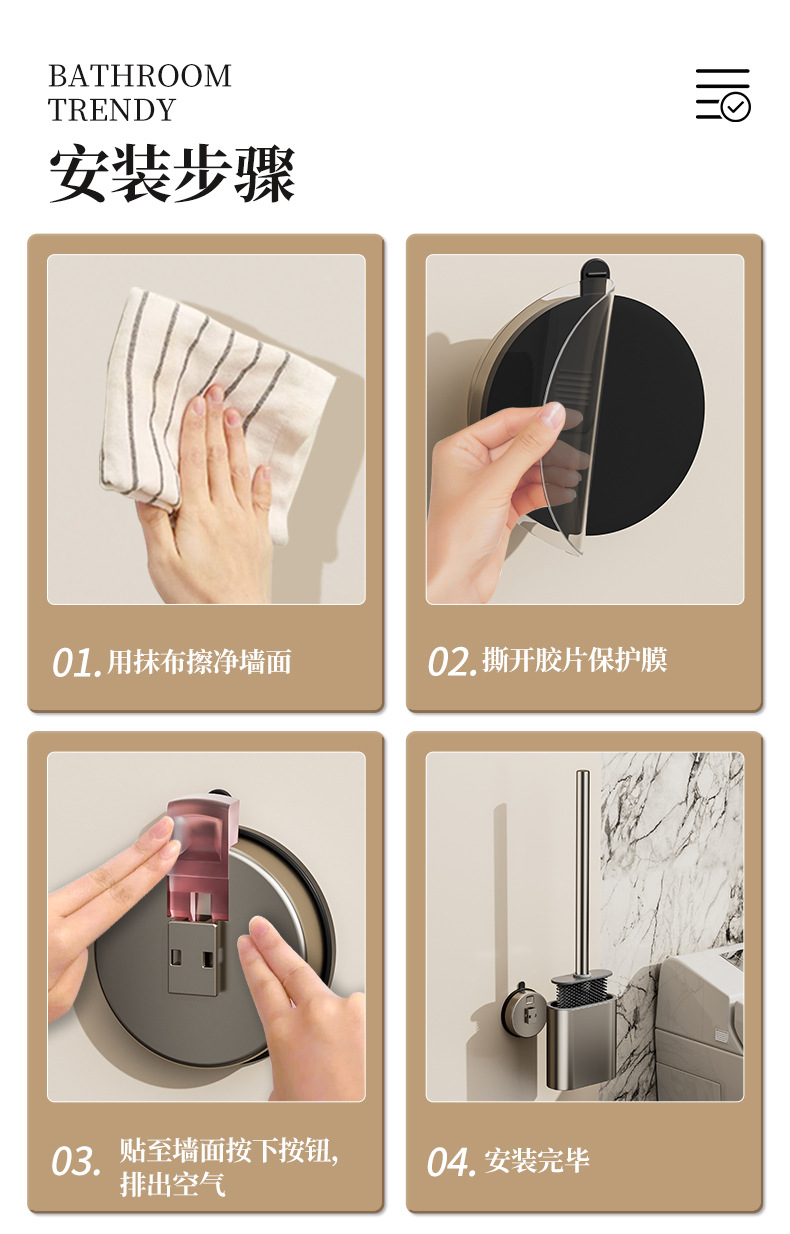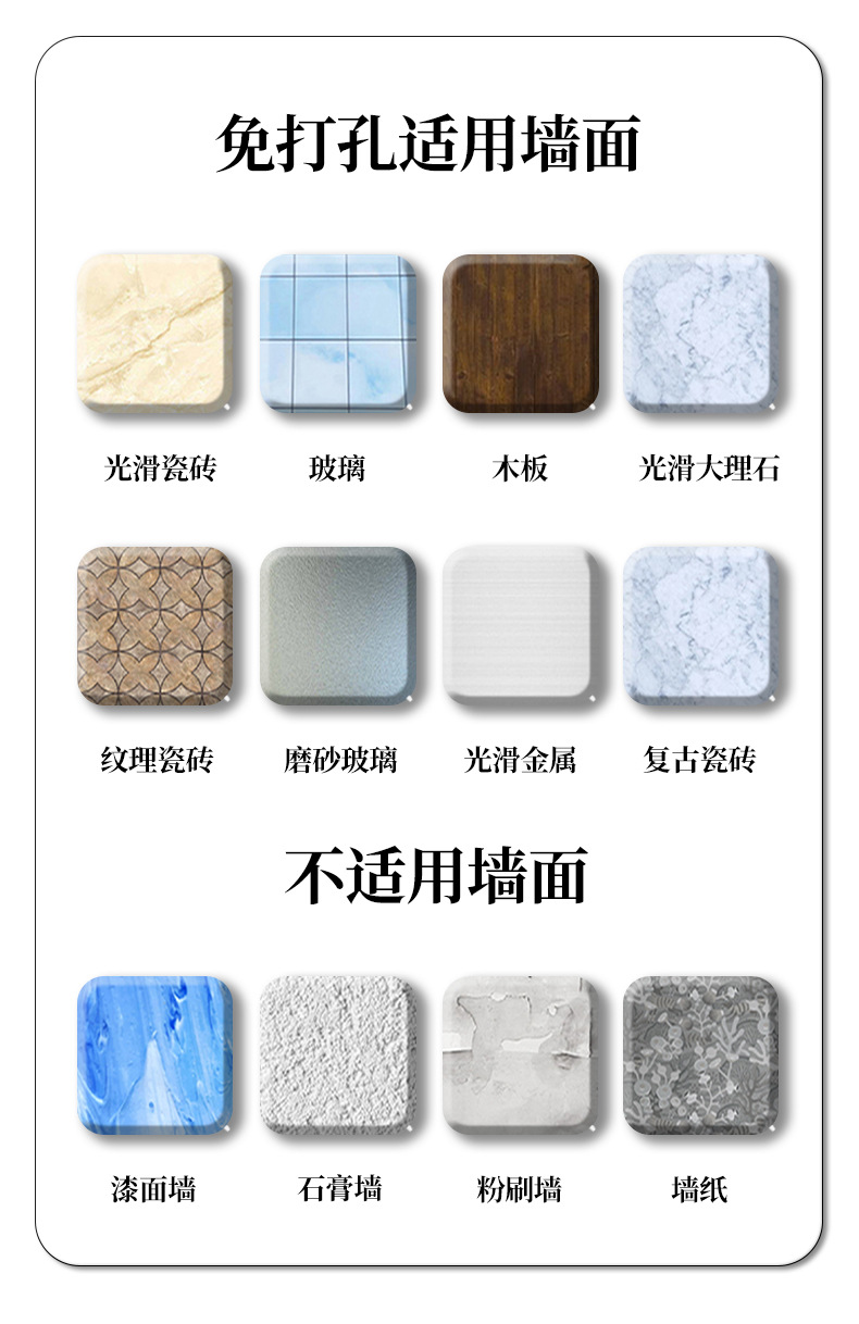 (2)安装请注意,墙面需平整坚固的玻璃瓷砖等。不可用在粉刷墙,墙纸,石灰墙等不平整不坚固的墙面上。