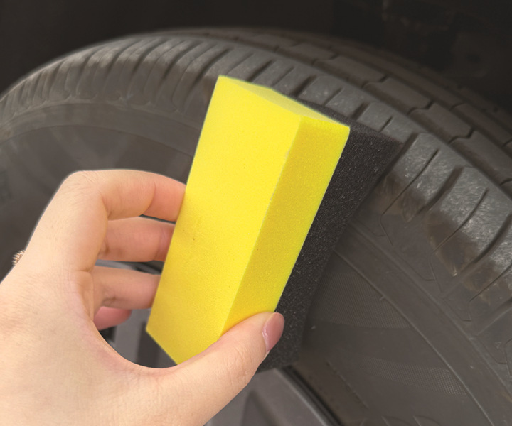角に洗車スポンジを拭き、EVAスポンジを拭き、ワックススポンジの三日月形のタイヤブラシを拭きます。