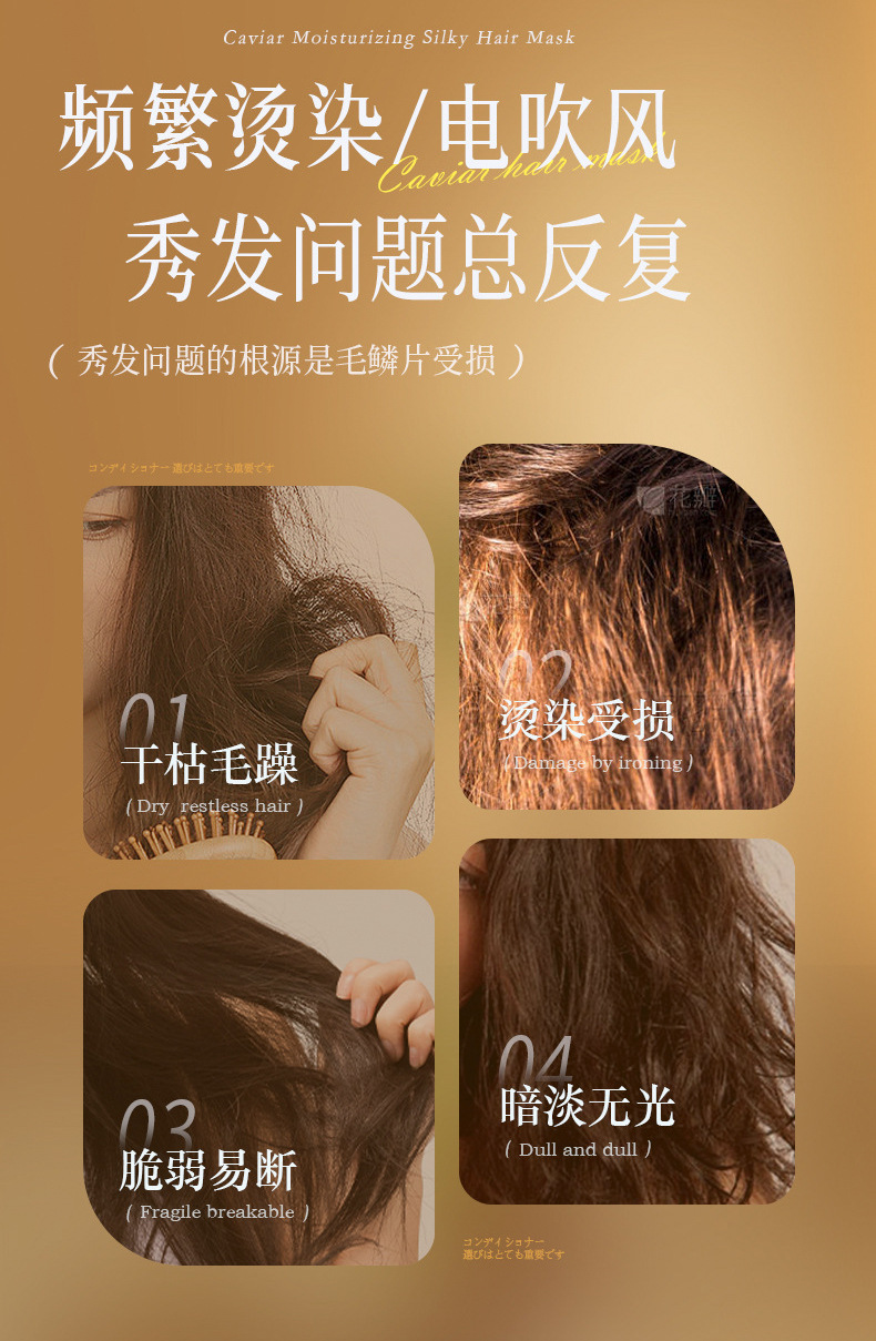 キャビアの髪膜を修理して、乾燥した毛を染めて、水を補います。