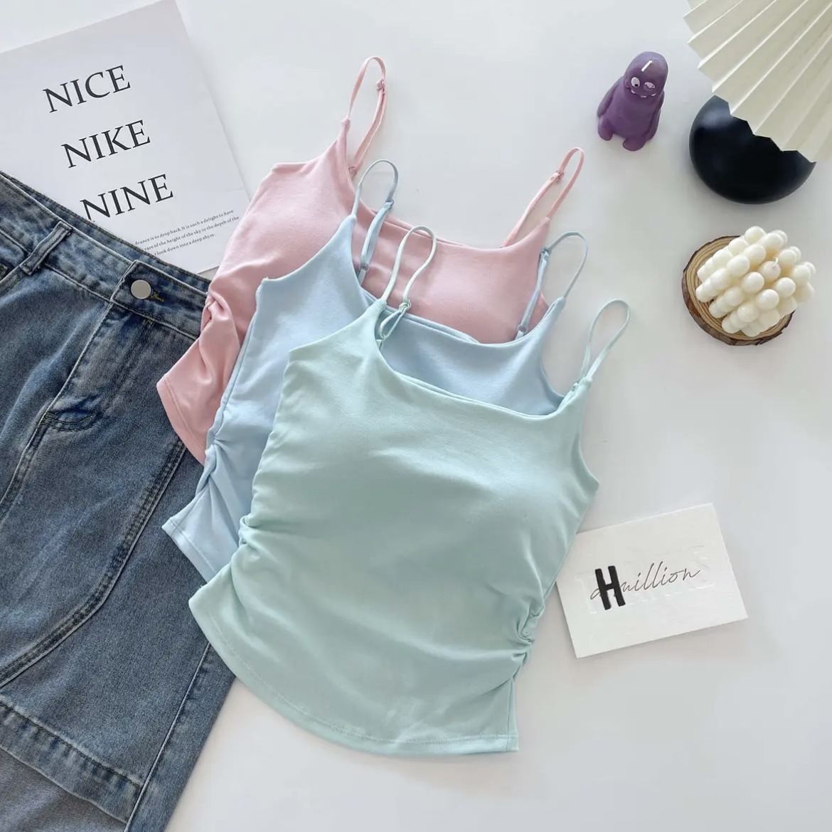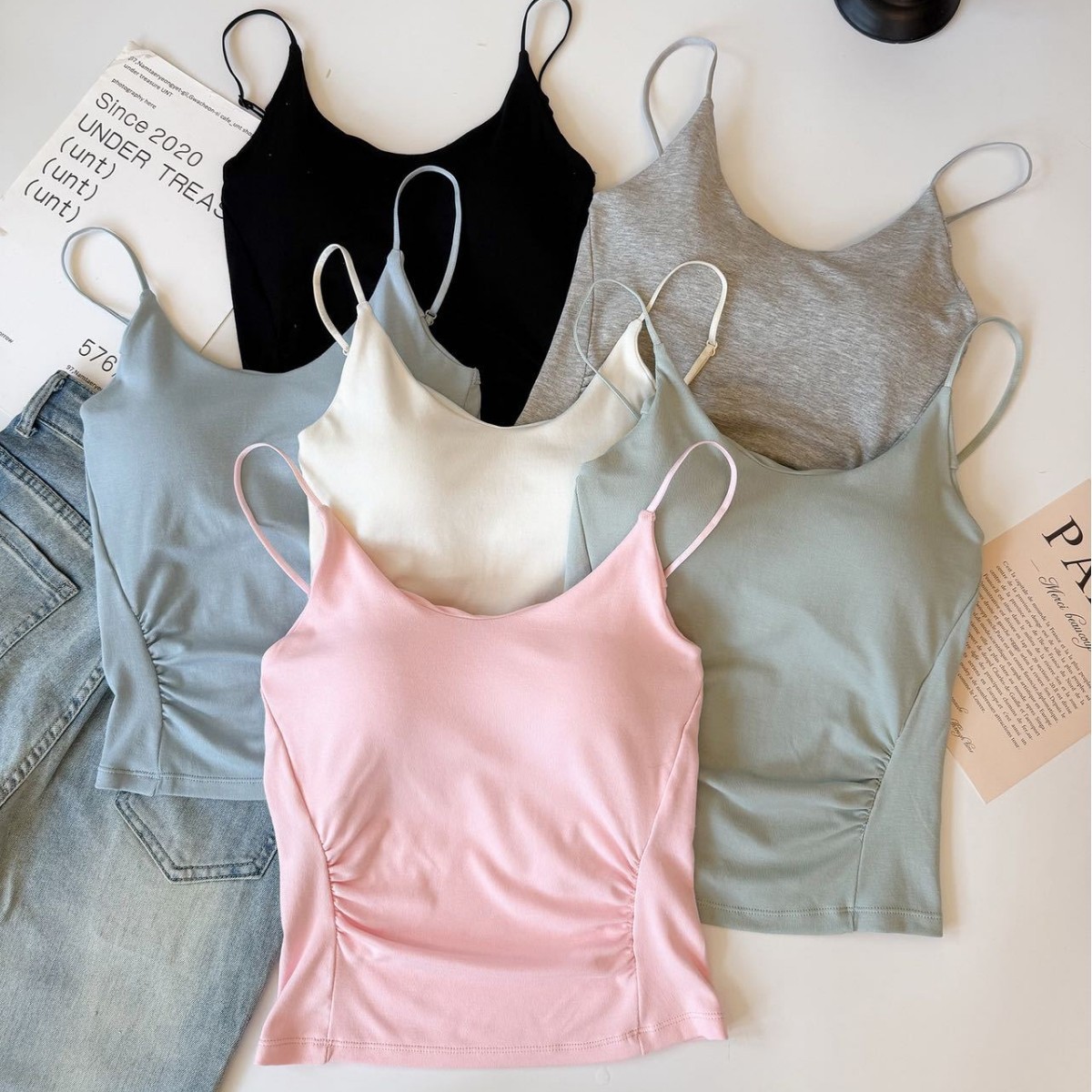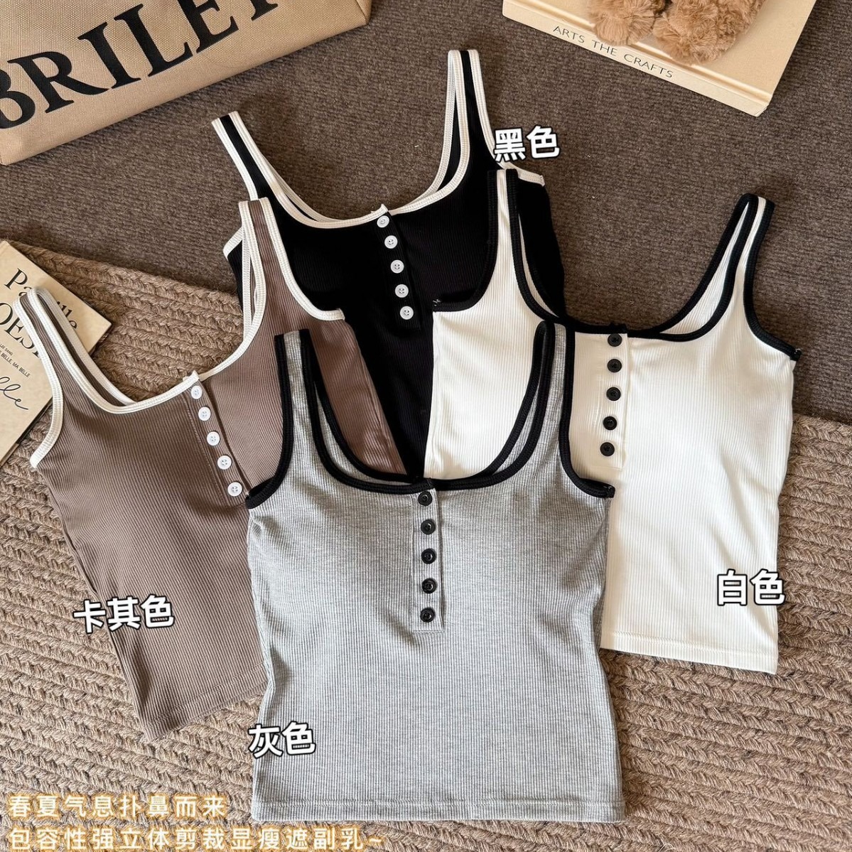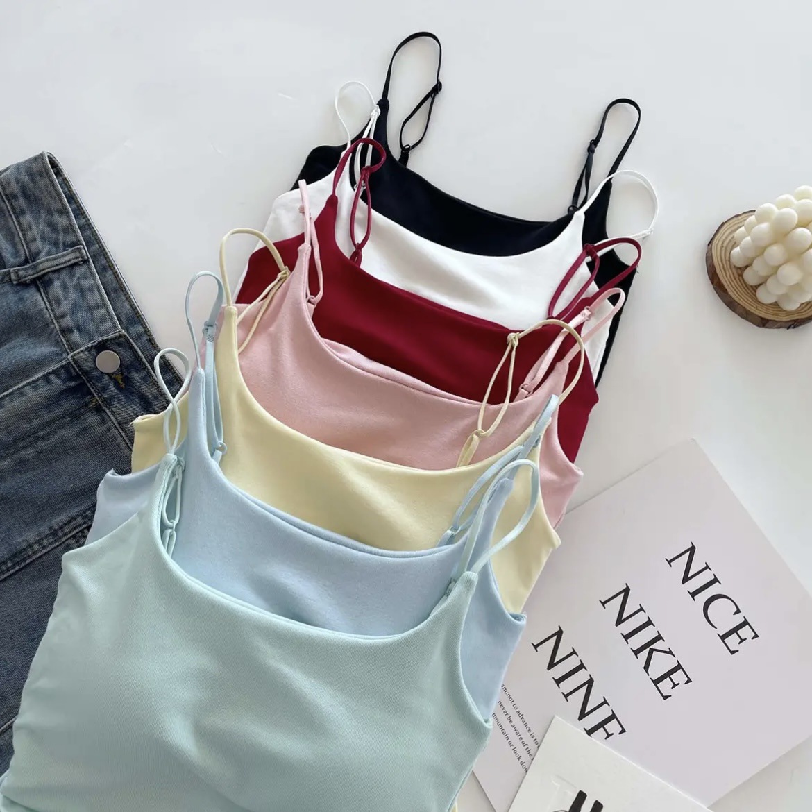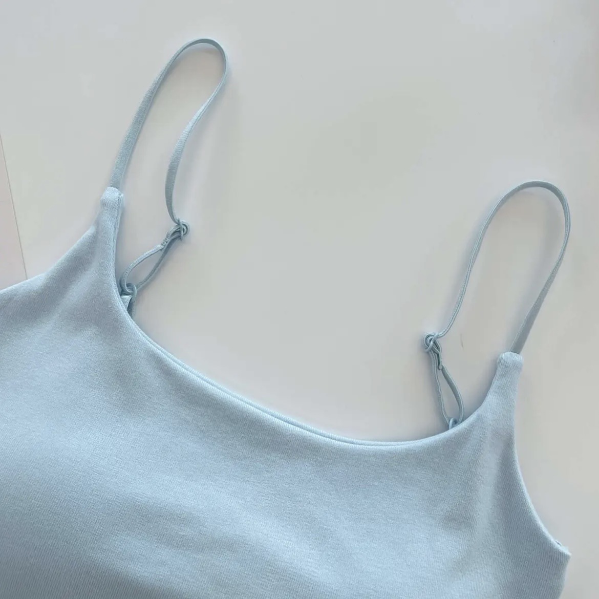純色のキャミソールの女性は夏に固定胸パッドを持って上着を着ます。