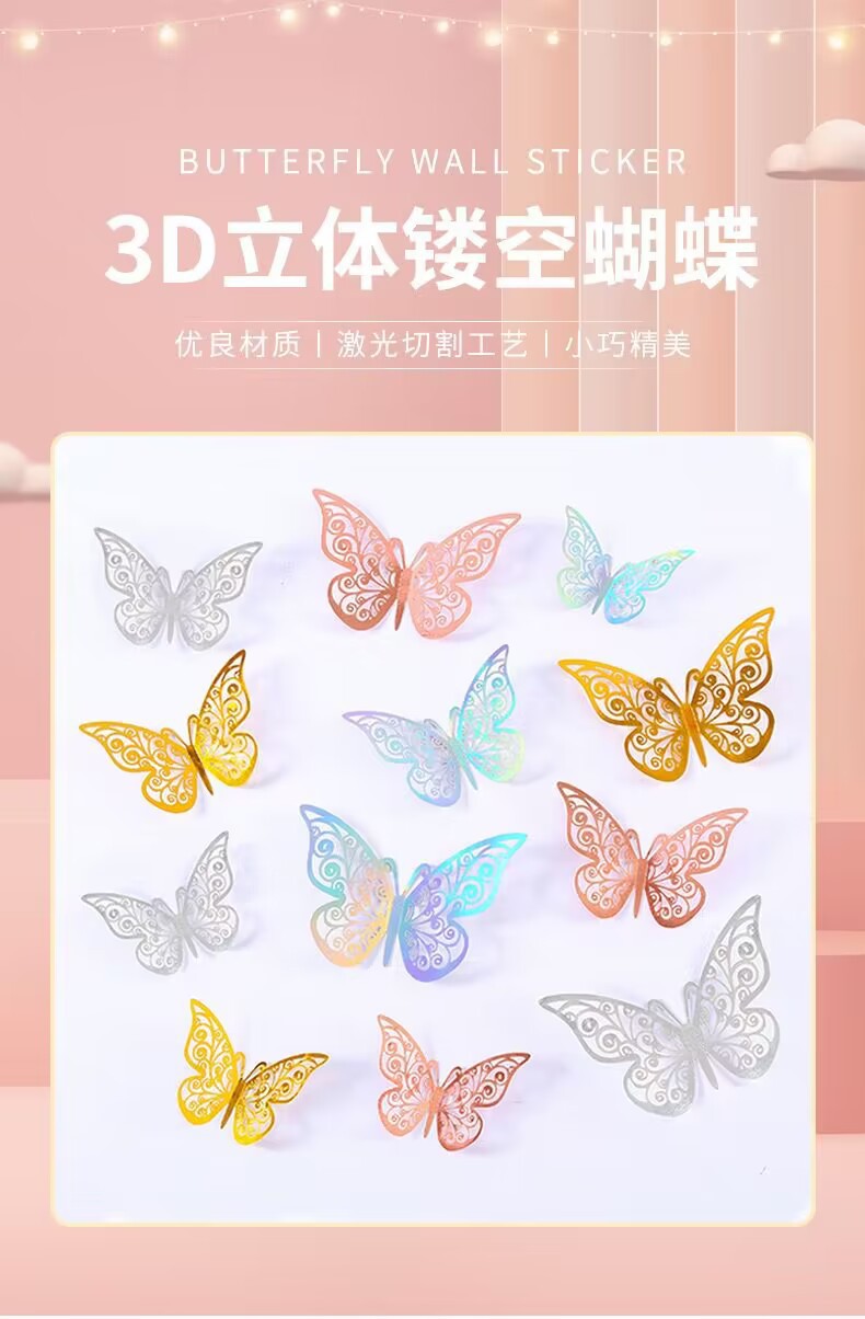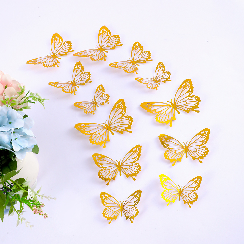12個の立体透かし彫り蝶壁紙シミュレーション金属質感蝶壁シールパーティー壁面装飾