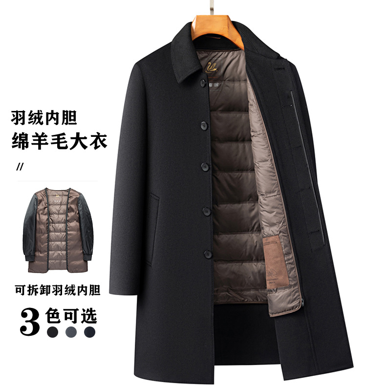 A9507秋冬长款羊毛双面尼外套男士可脱卸羽绒内胆翻领羊毛呢