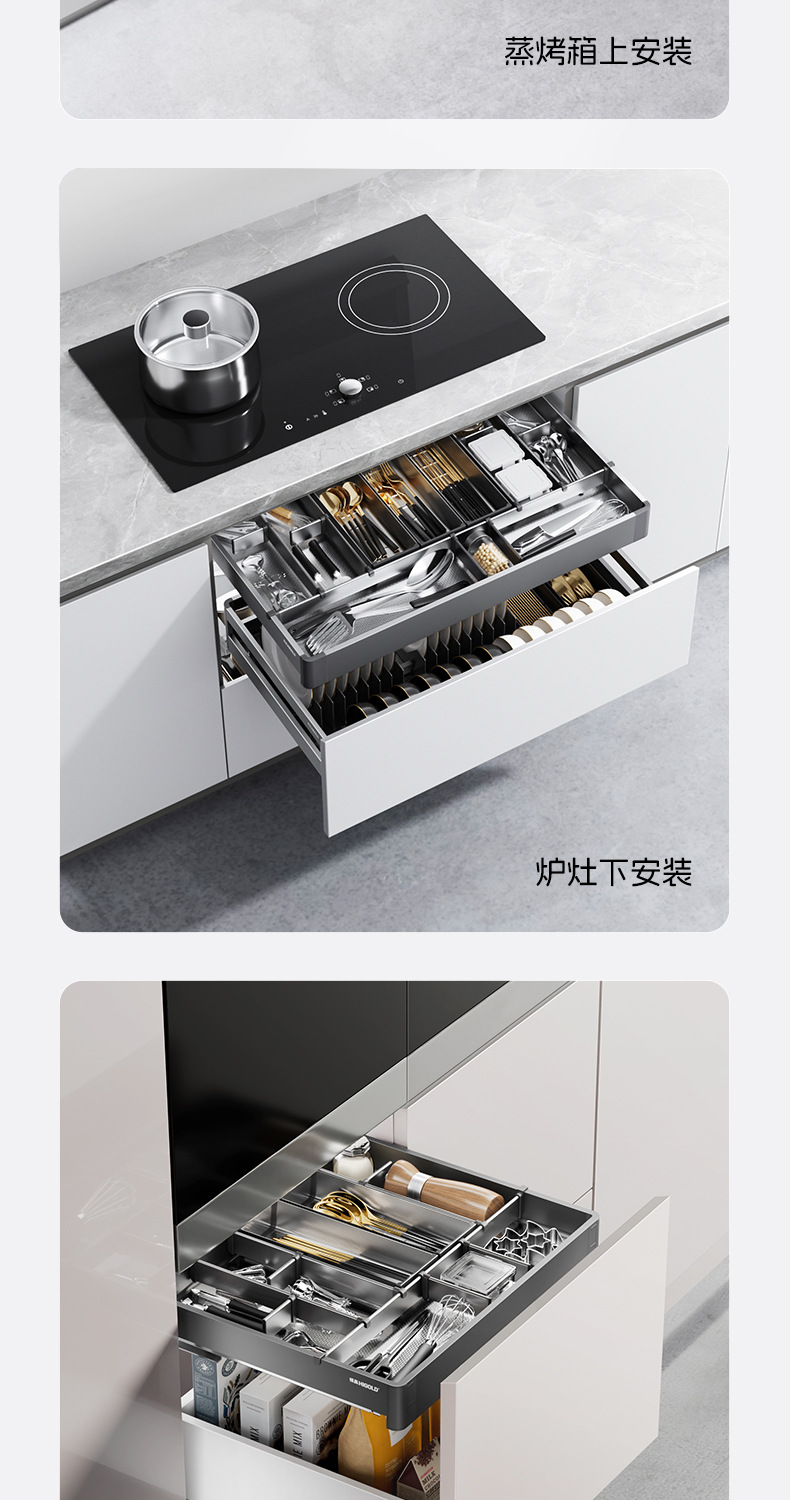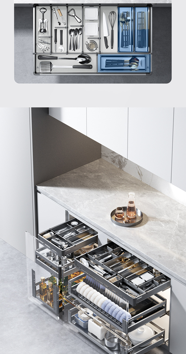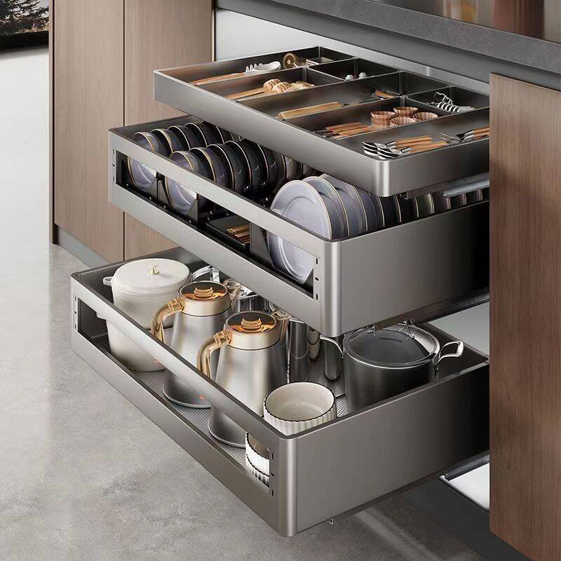ハマー高キッチンキャビネット引き出し二重引き出し式アルミ合金食器皿バスケット304ステンレスキャビネット調味料バスケット