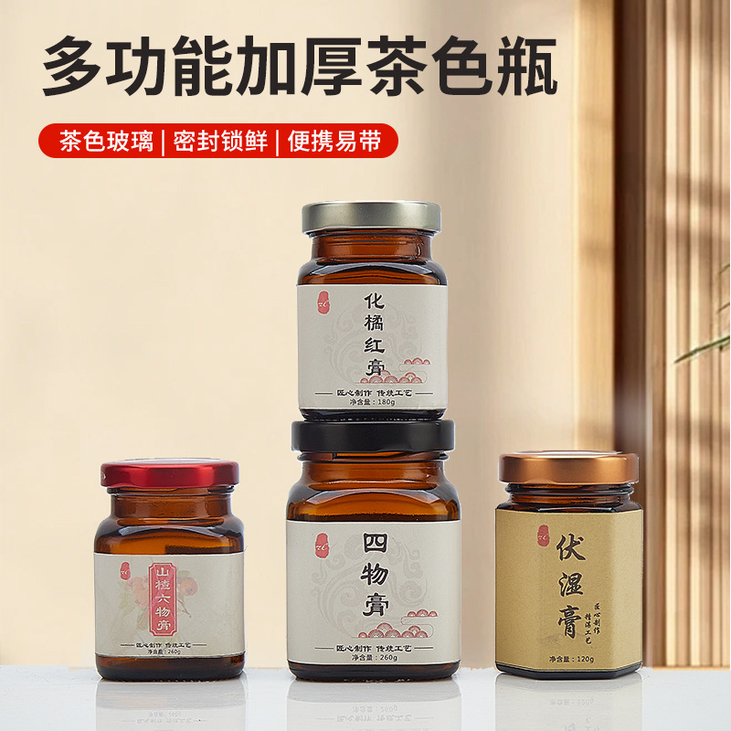 厂家批发膏滋瓶茶色玻璃方形瓶六棱瓶食品密封罐秋梨膏分装瓶玉灵