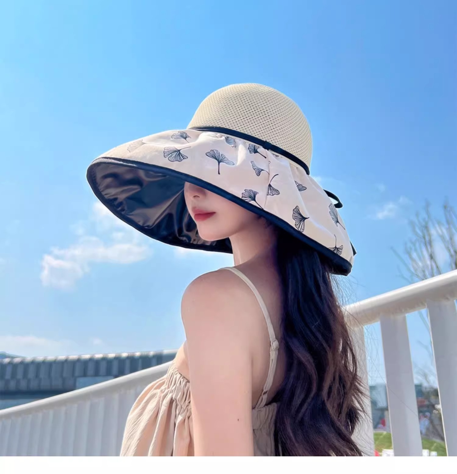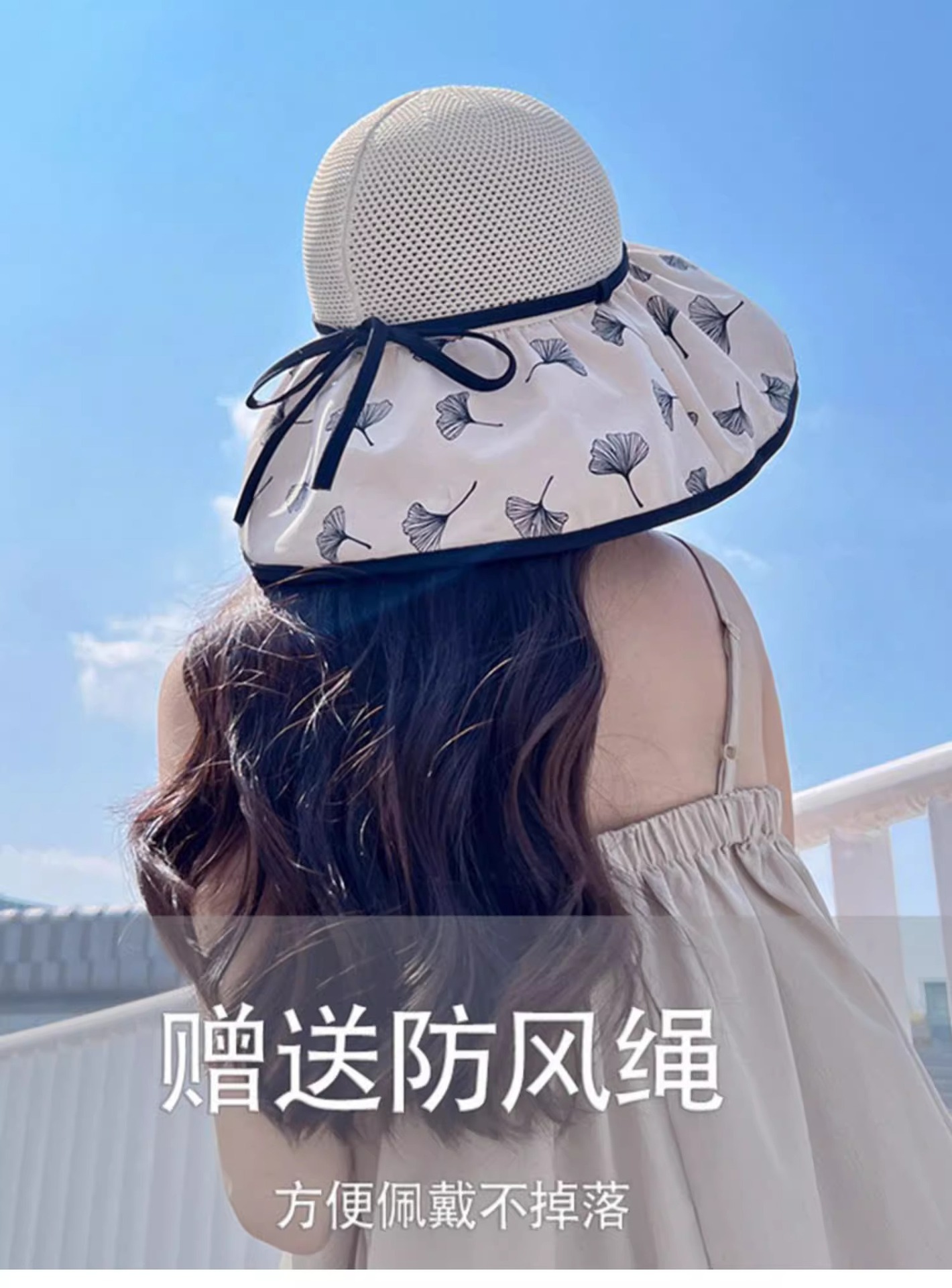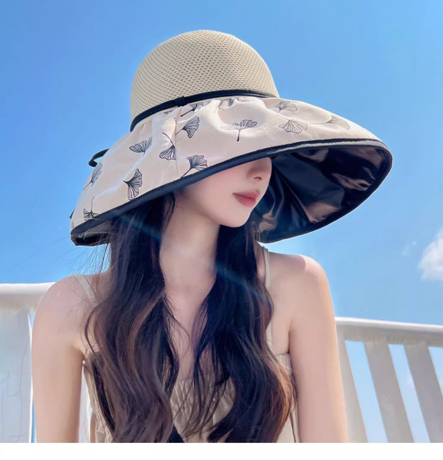 2025新型韓国版屋外黒ゴム日よけ日焼け止め百合太陽帽子女性モデル夏蝶結び漁師帽