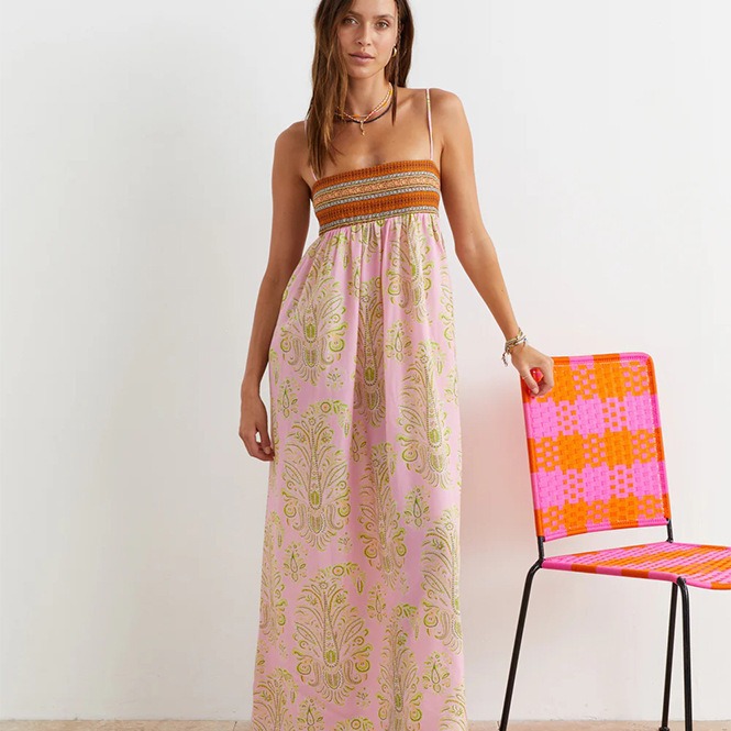 2024新型欧米クロスボーダー速売通独立駅セクシーストラップ落書き綿麻プリント大振り子ワンピース女性