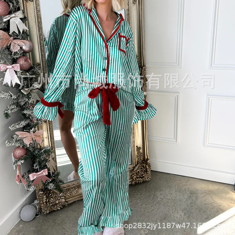 亚马逊爆款条纹长袖家居服两件睡衣套装春秋款女装慵懒开衫家居服