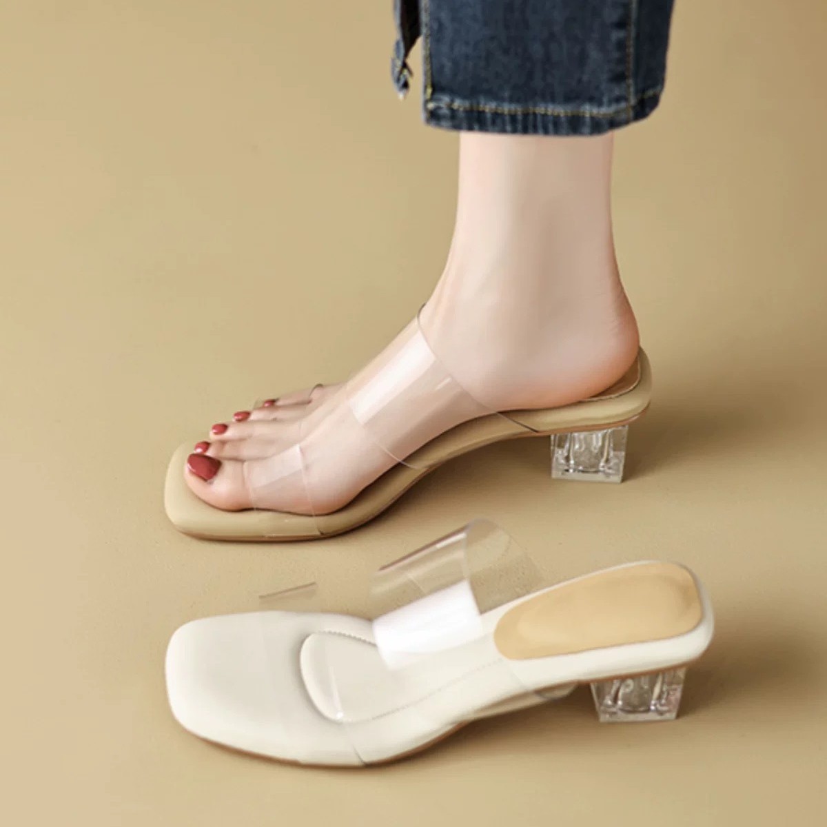 小柄な人でも疲れにくい、夏に履ける女性用サンダル、クリスタルシューズ、太めヒール、ミディアムヒール、透明フレンチイブニングスタイルサンダル