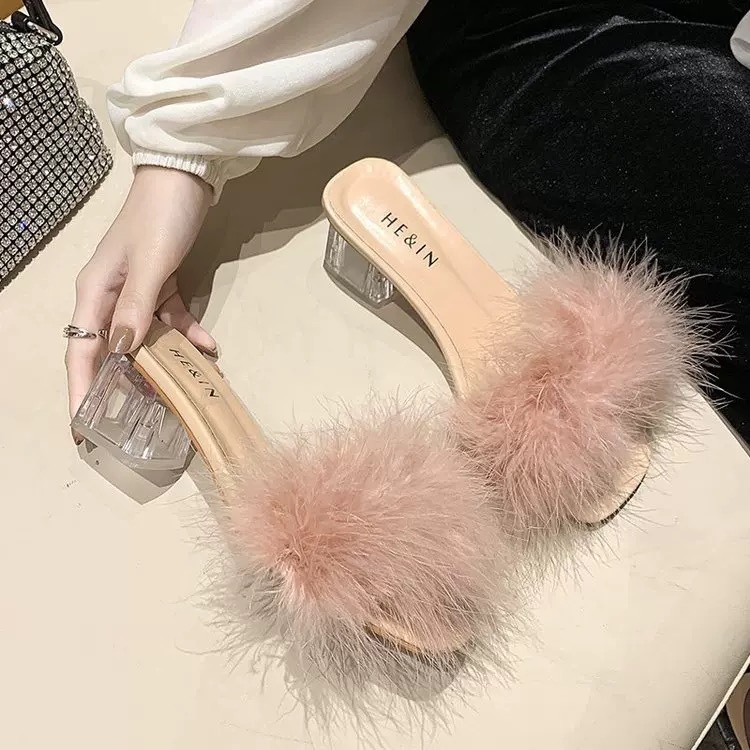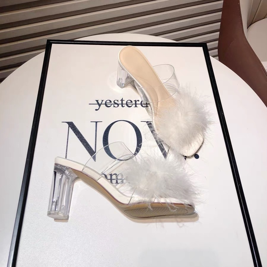 仙女风羽毛高跟凉拖鞋女外穿2025夏季新款水晶透明跟气质配裙子穿