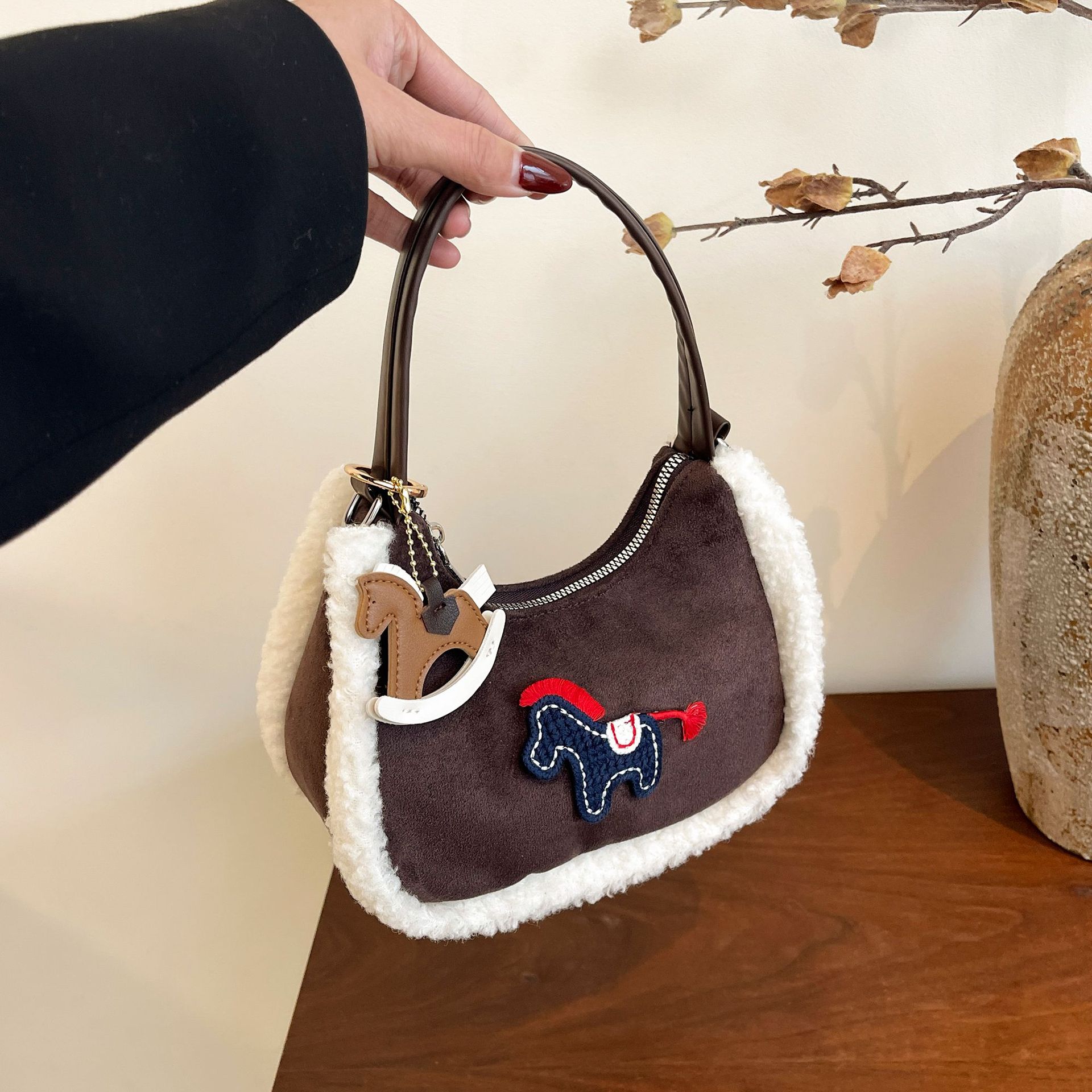 跨境卡通小马时尚水饺包高级洋气毛绒拼接手提洋气小众个性斜挎包