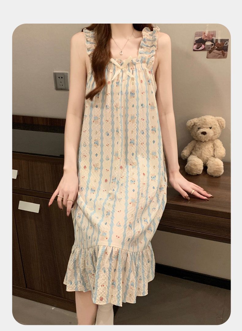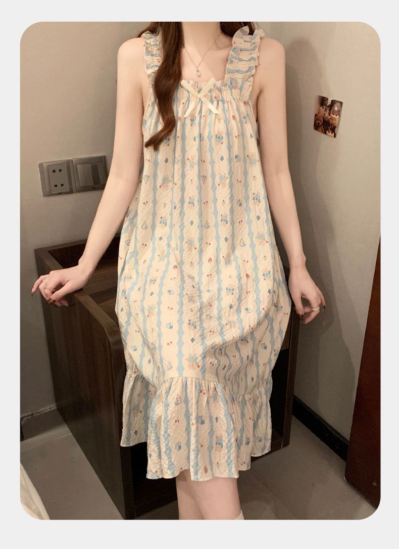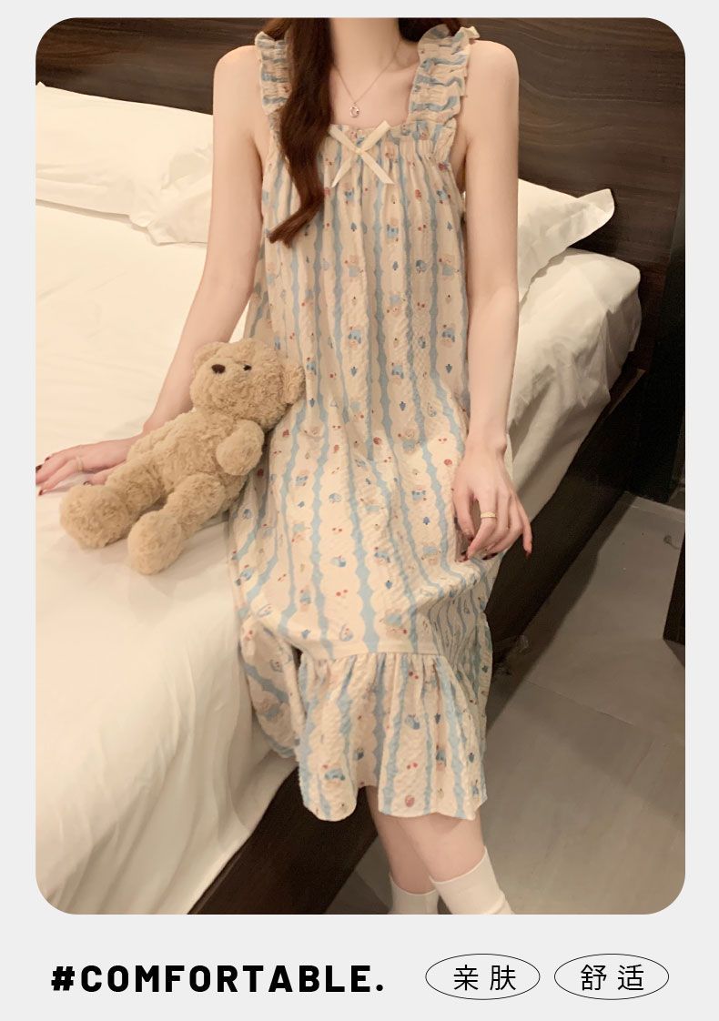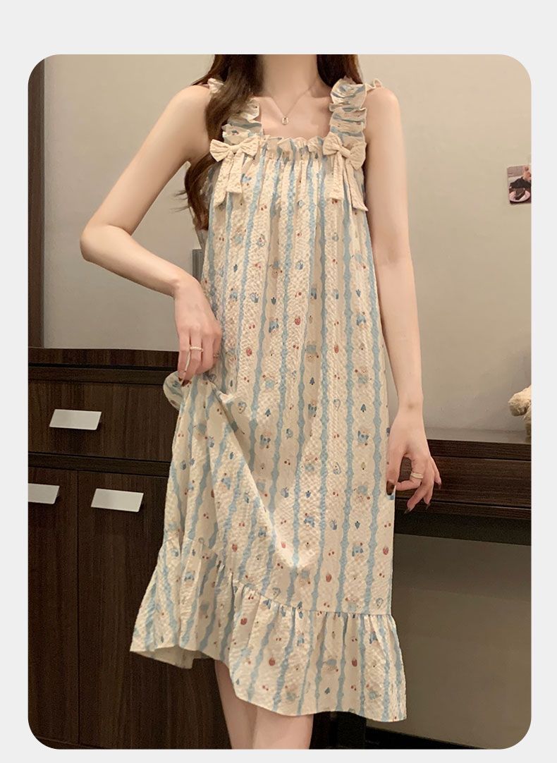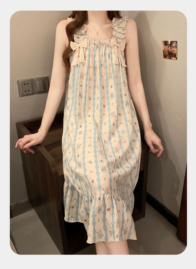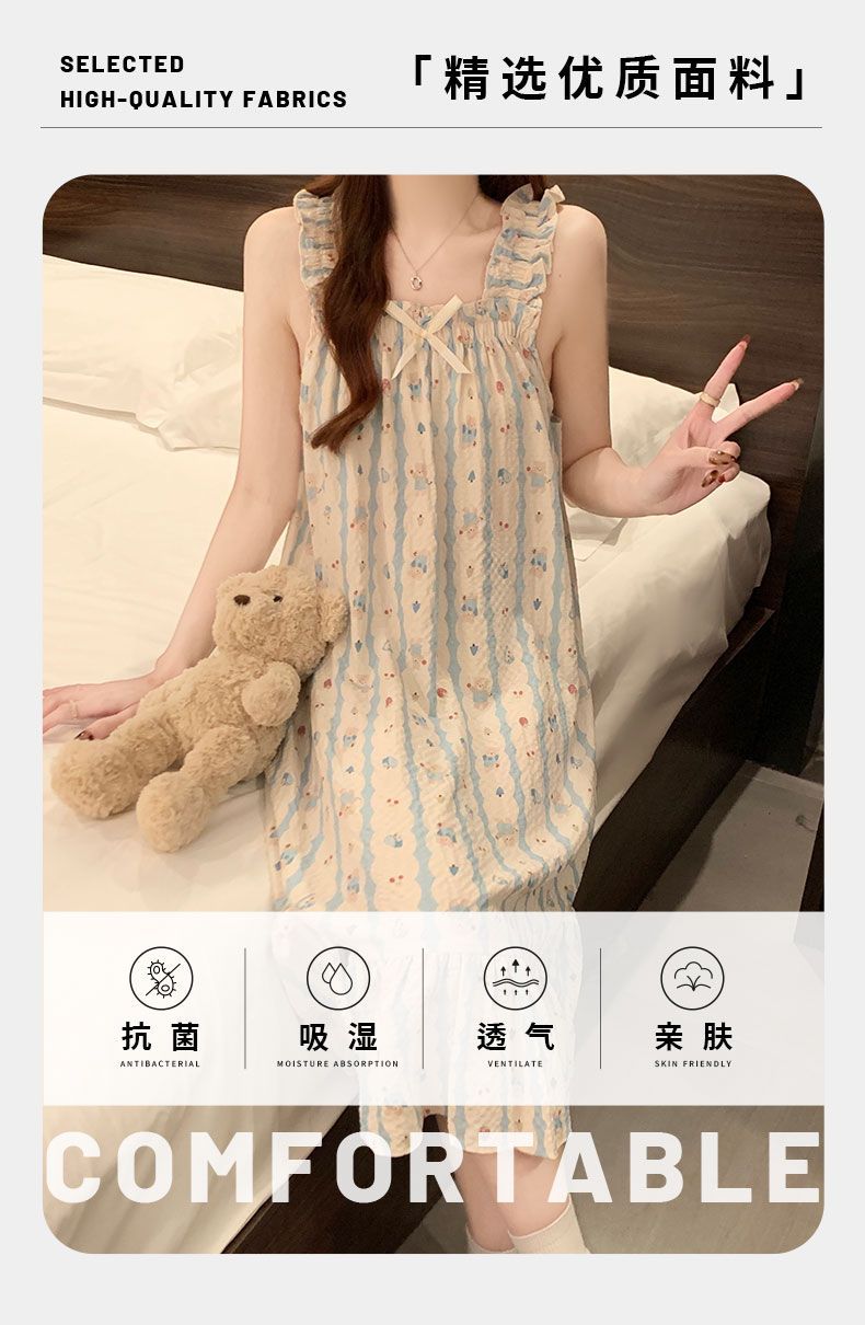 睡衣女夏季新款泡泡棉无袖吊带中长睡裙少女甜美可爱家居服可外穿