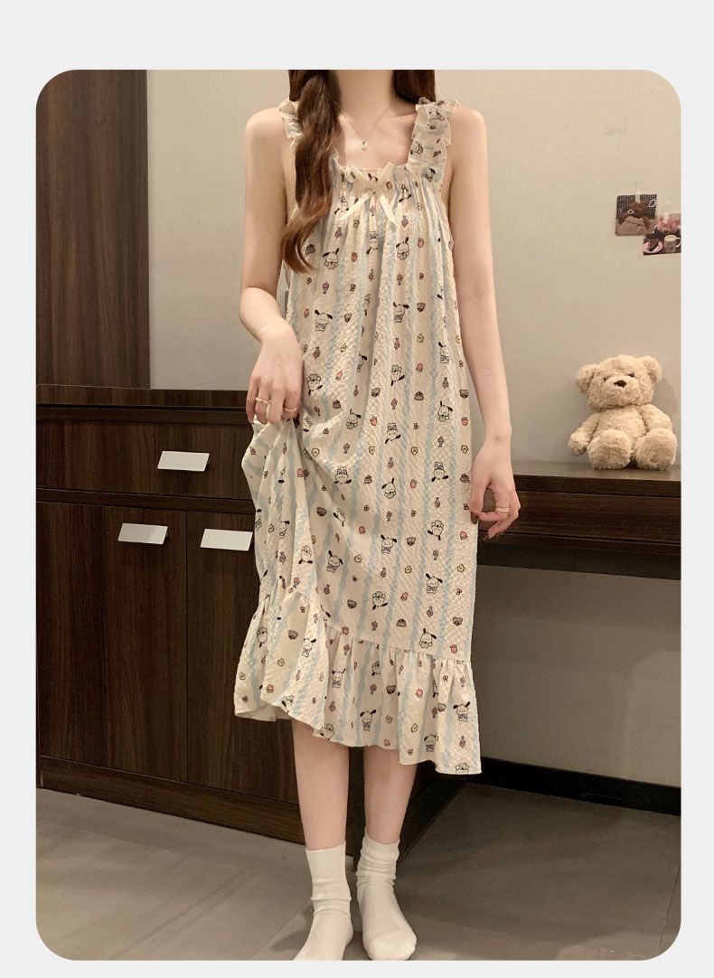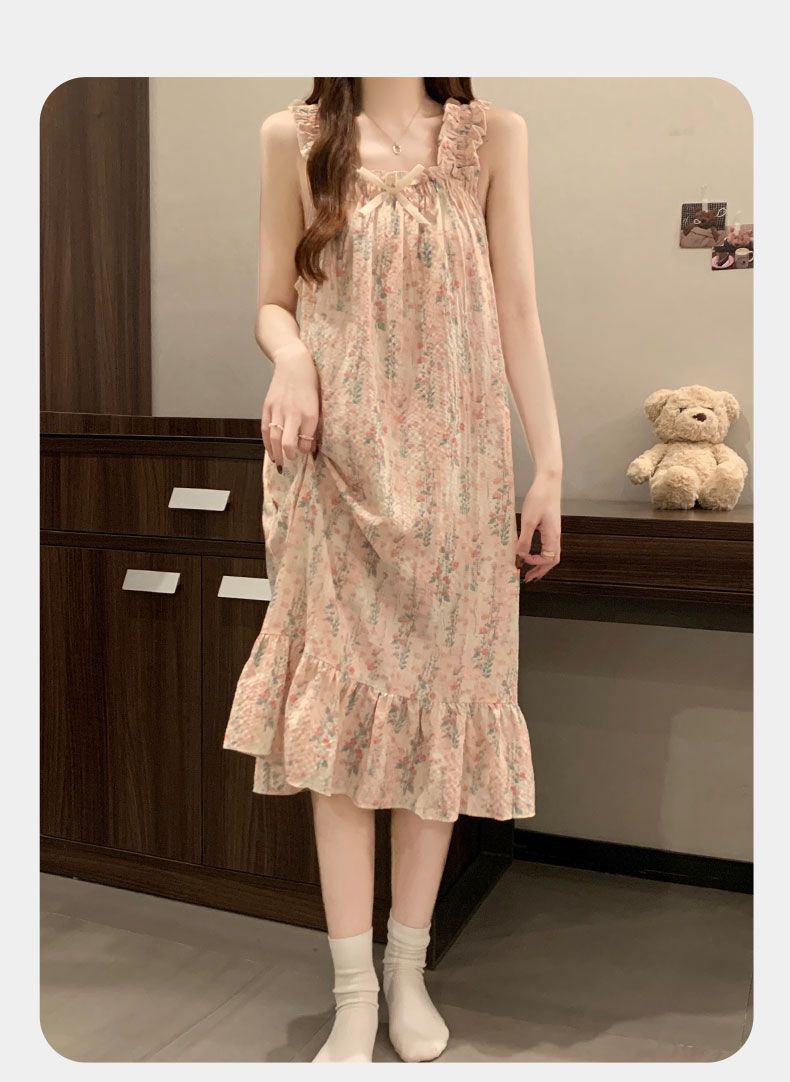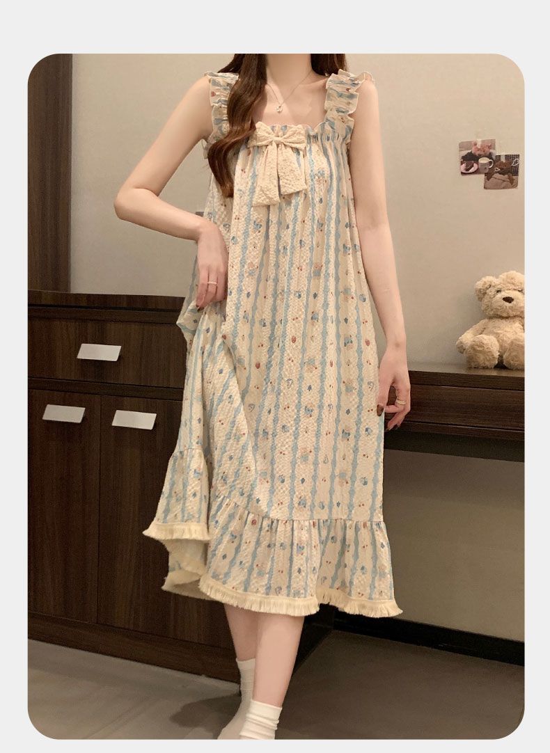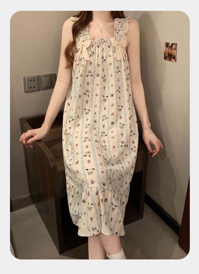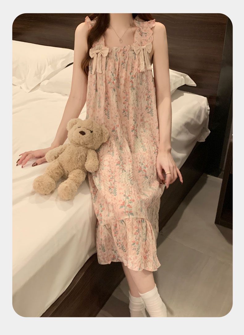 睡衣女夏季新款泡泡棉无袖吊带中长睡裙少女甜美可爱家居服可外穿
