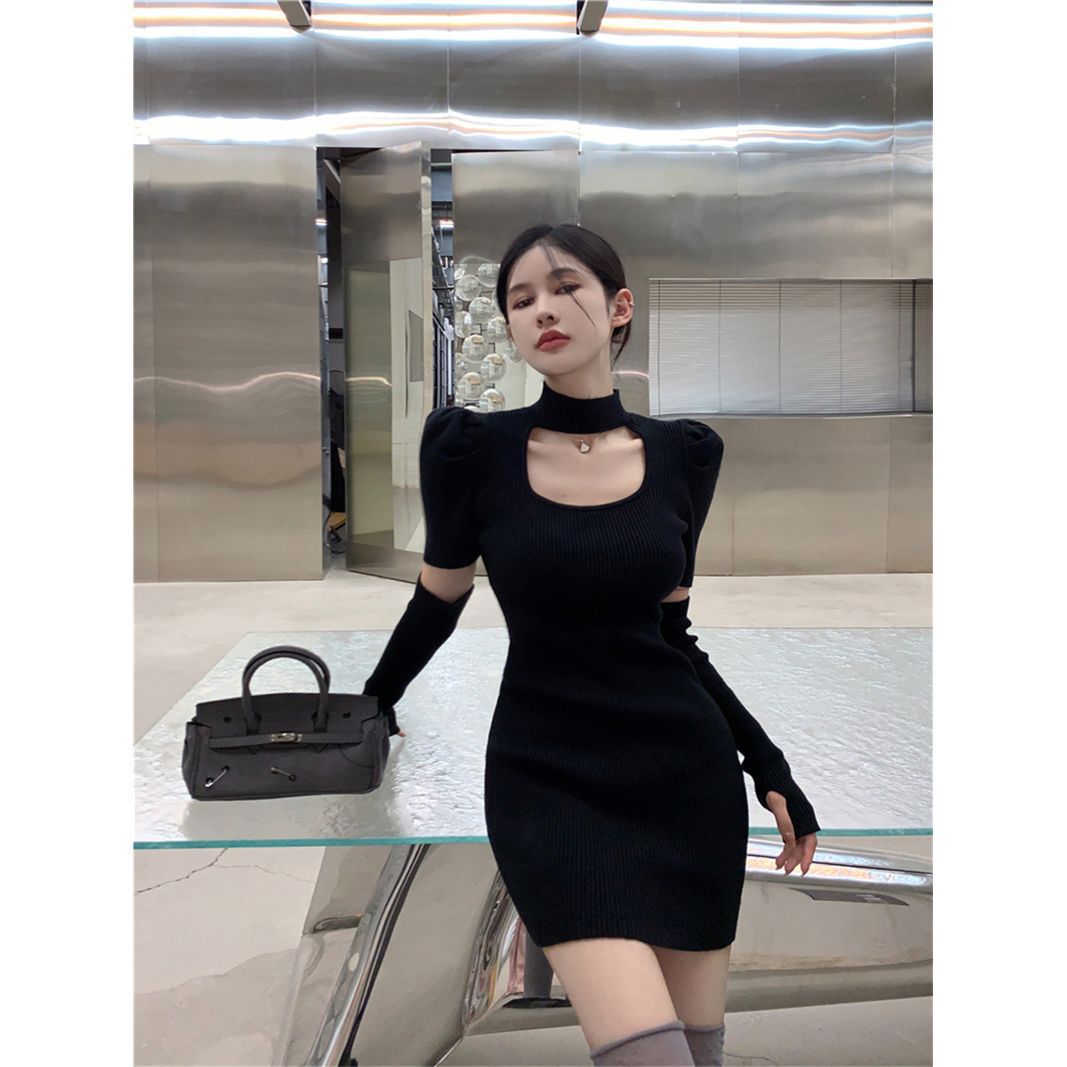 純粋な欲風の黒い肩のセクシーなギャルの長袖のワンピースの女性の秋冬の金の修身はお尻のスカートの潮を包みます。