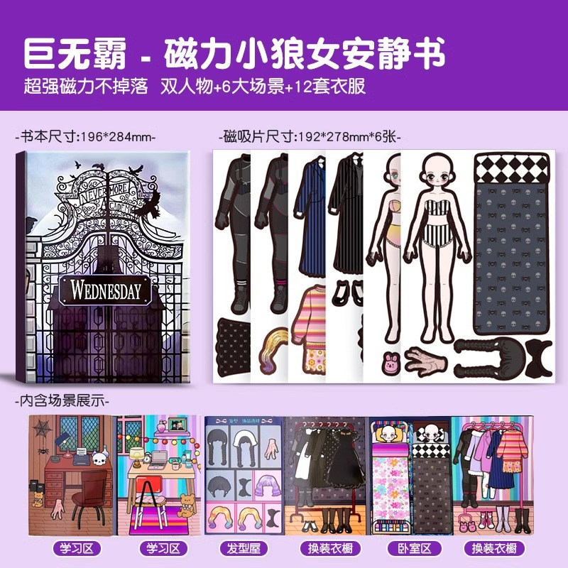 黒い水曜日とオオカミの女性の静かな本の新しい女の子はステッカーの王女を裁断して子供のおもちゃに着替えます。
