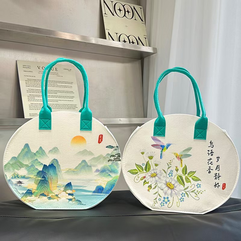 フェルトバッグ国風山水印刷可能図案ロゴギフトバッグ大容量厚型円形フェルトハンドバッグ