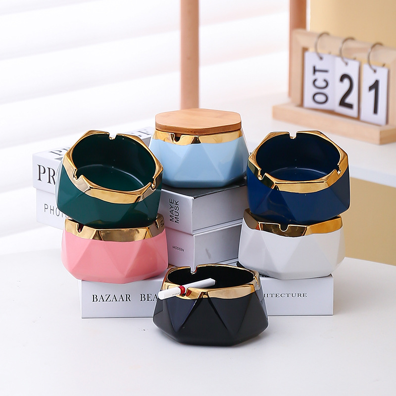 北欧の軽い豪華な高級陶磁器の幾何学の灰皿の家庭の創意の個性の潮流は蓋を持って飛んでほこりを防ぐ置物を持ちます。