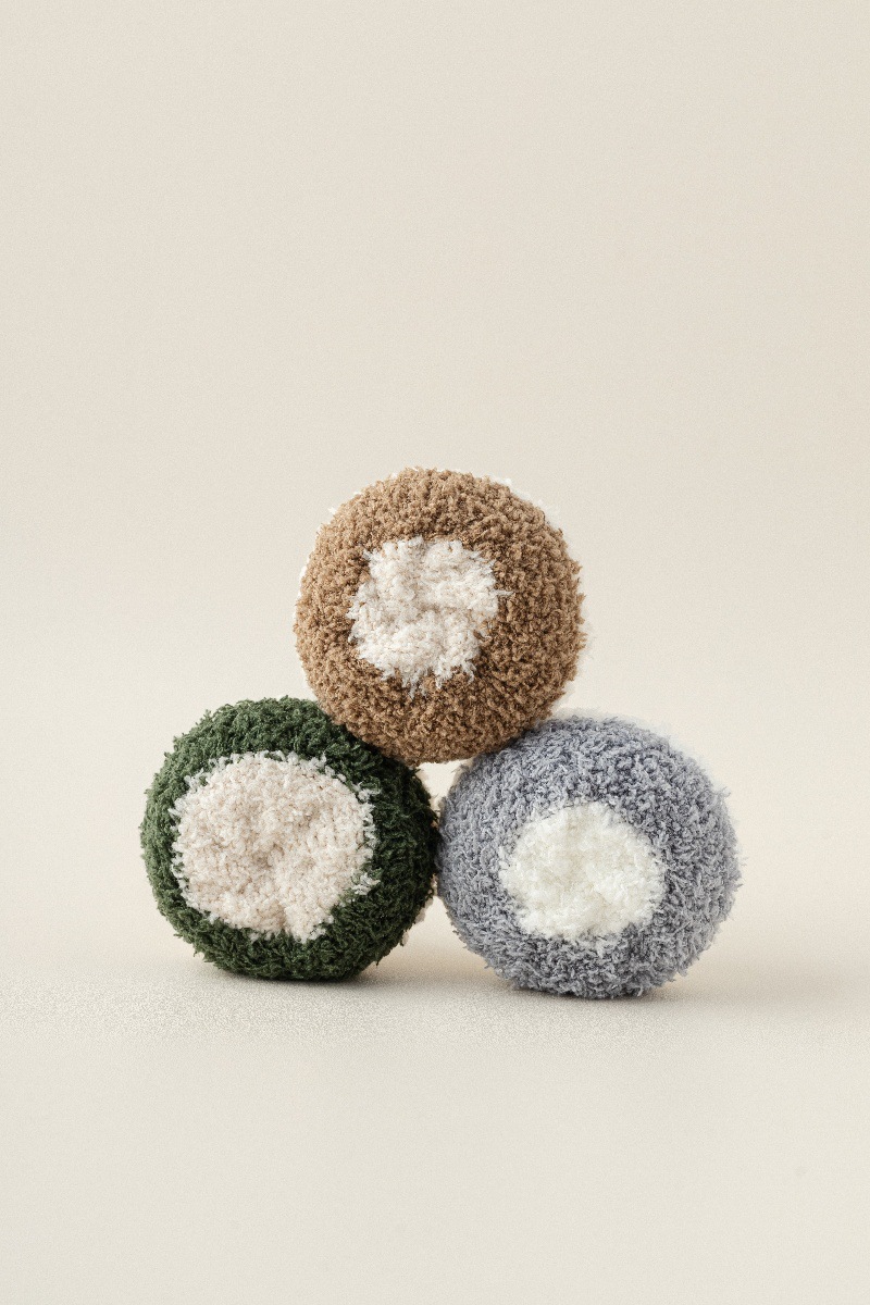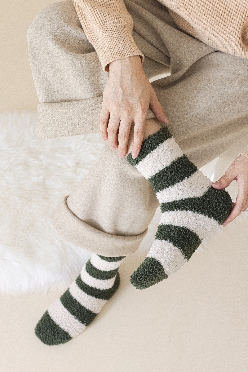 ぬいぐるみの床のサンゴの毛の猫は靴下の女性を捕まえます。