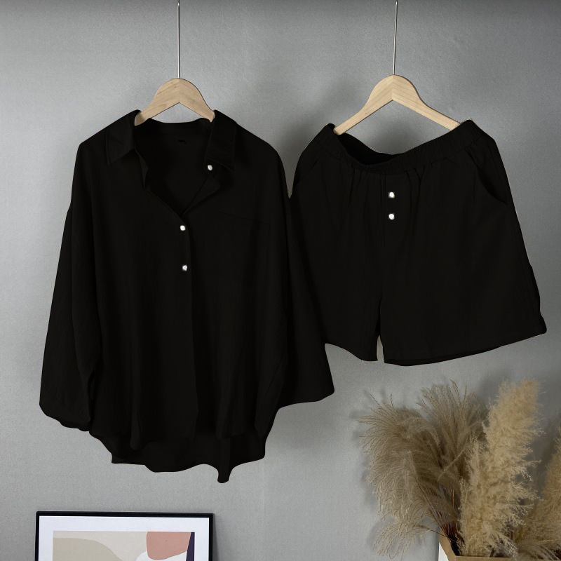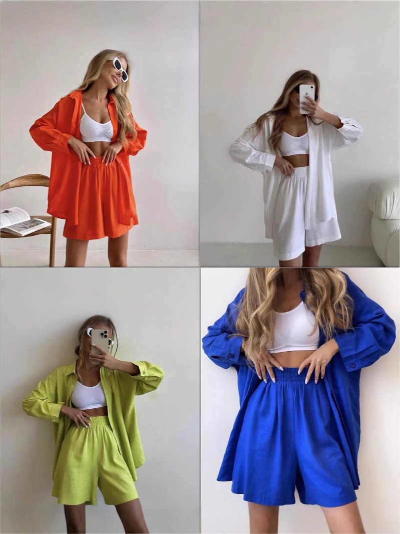 アマゾンのクロスボーダーのファッション春のゆるい単列は長袖の純色のシャツの大きいサイズの婦人服のカジュアルな半ズボンのスーツの女性を掛けます。