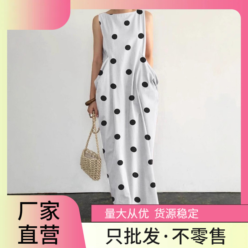 2023欧米のアマゾンの越境する新型の波点の長いスカートのポケットのゆったりしているカジュアルな丸首のワンピースの対外貿易の卸売り