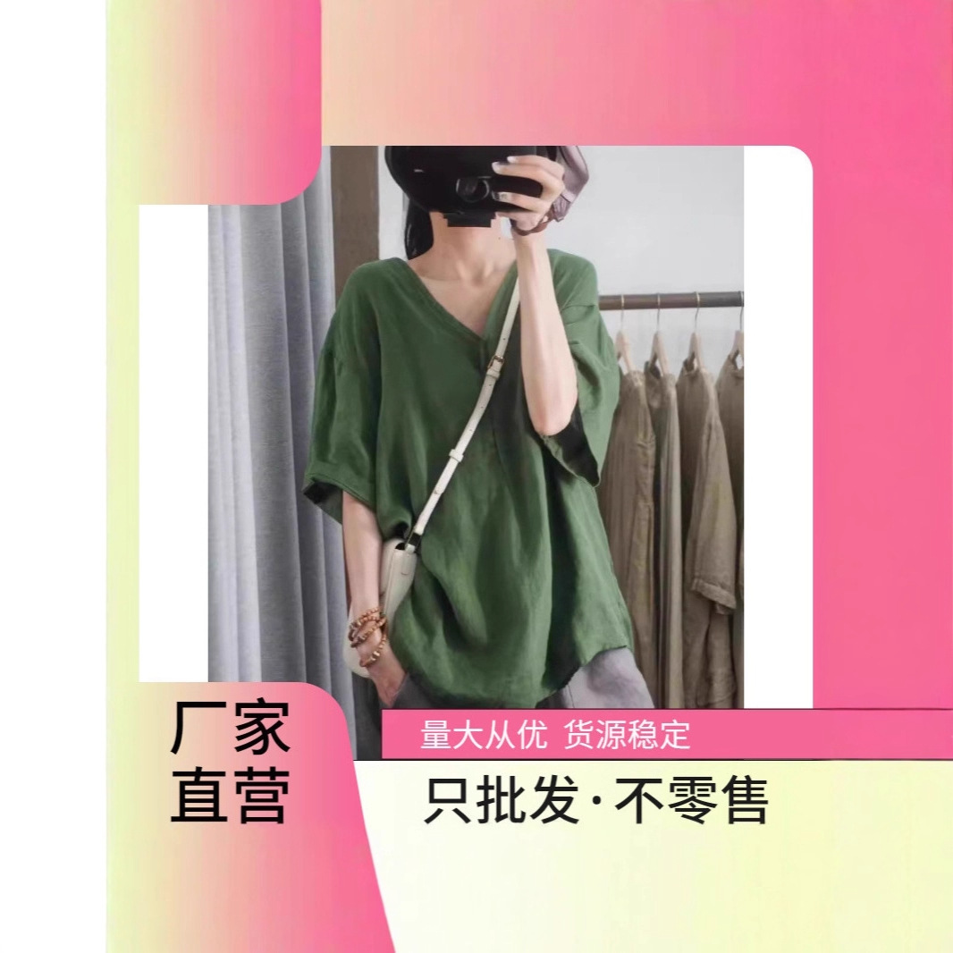 2024夏の新型半袖カジュアル太った女性シャツの大きいサイズのゆるい綿麻上着の女性の対外貿易卸売り