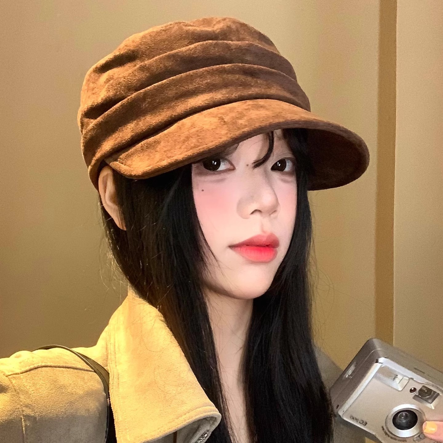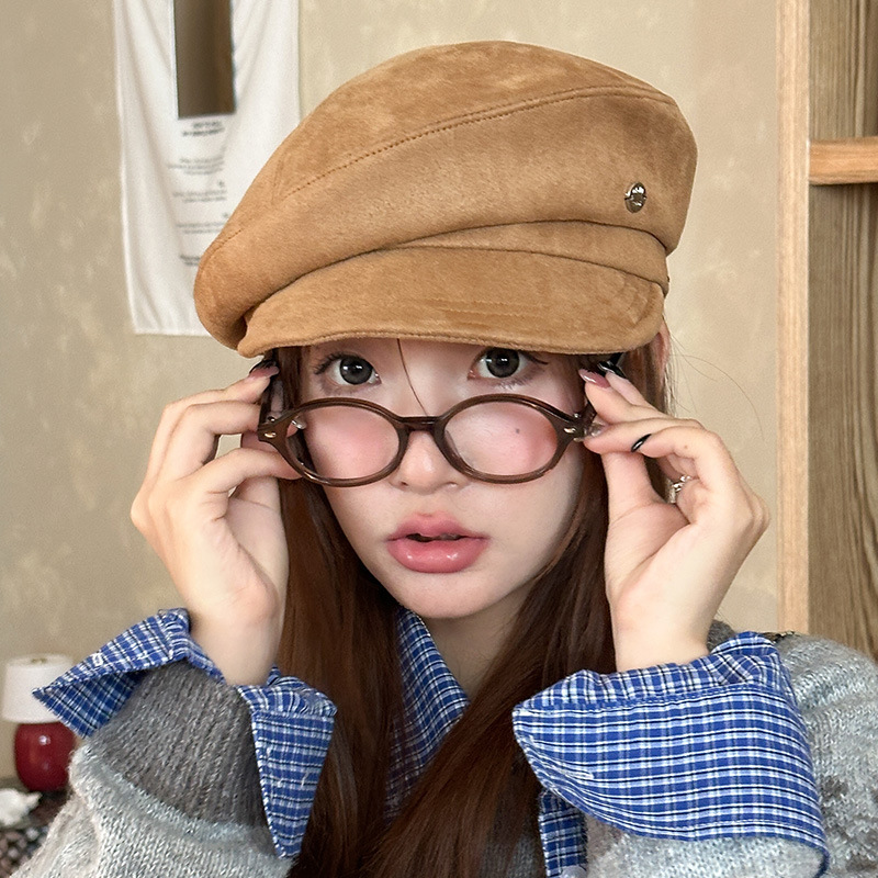 日系麂皮绒平顶贝雷帽女秋冬季新款复古显脸小鸭舌帽百搭八角帽子