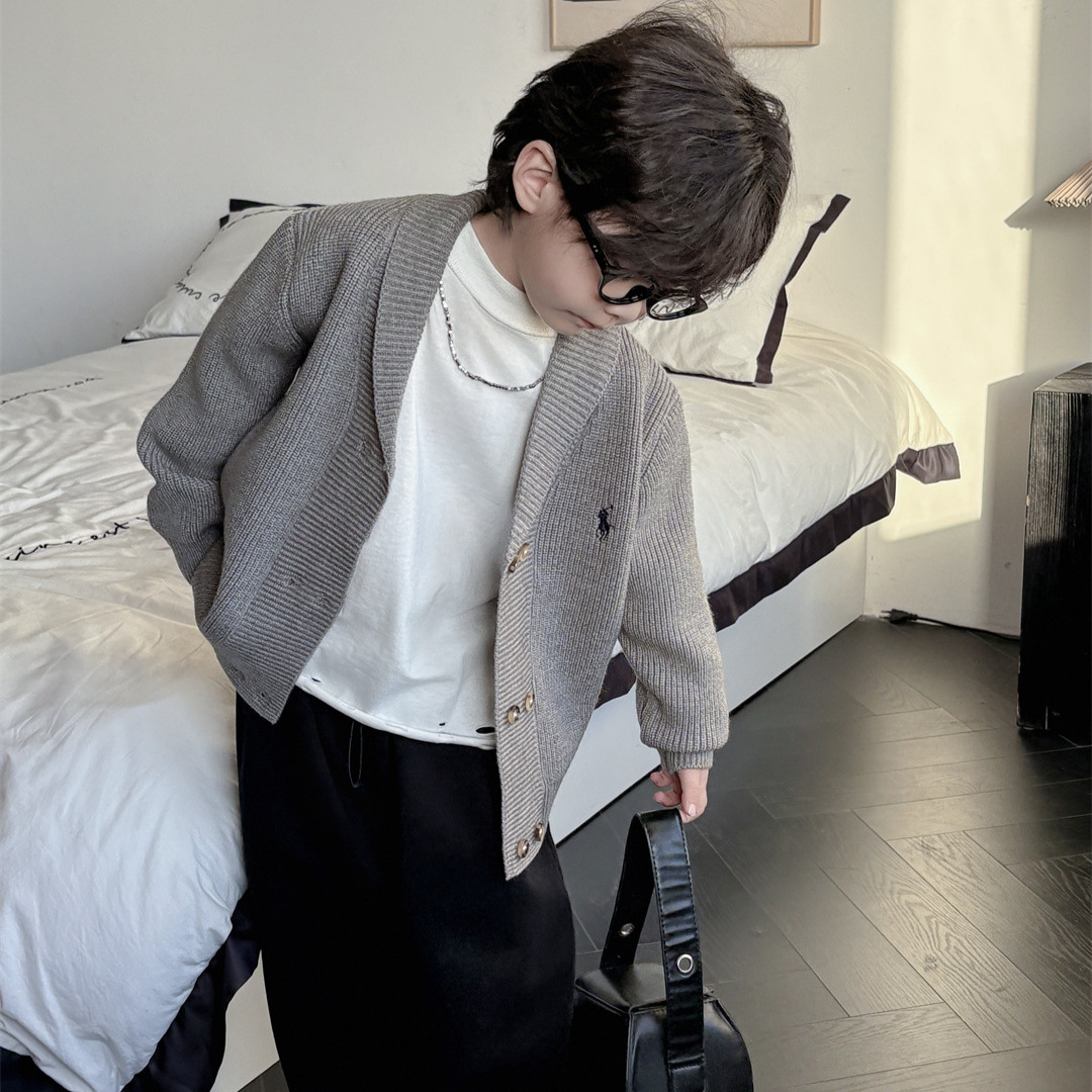 2025年の春の男の子のニットのカーディガンのセーターは韓国版の上着のゆったりとしたコートのレトロなファッションのだらだらしています。