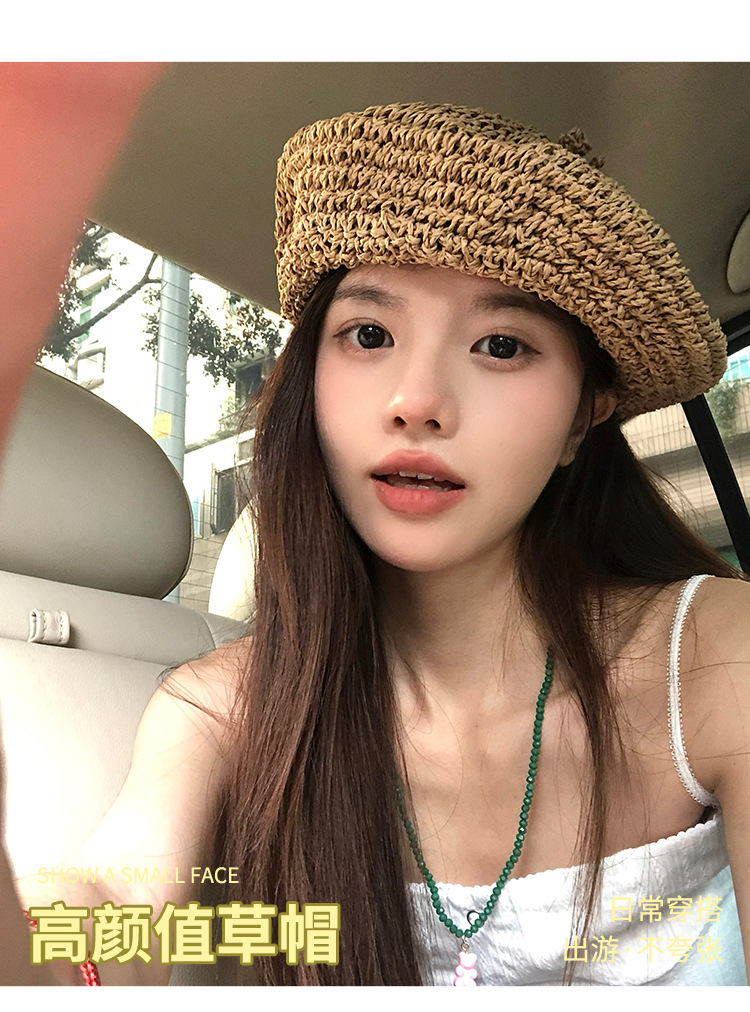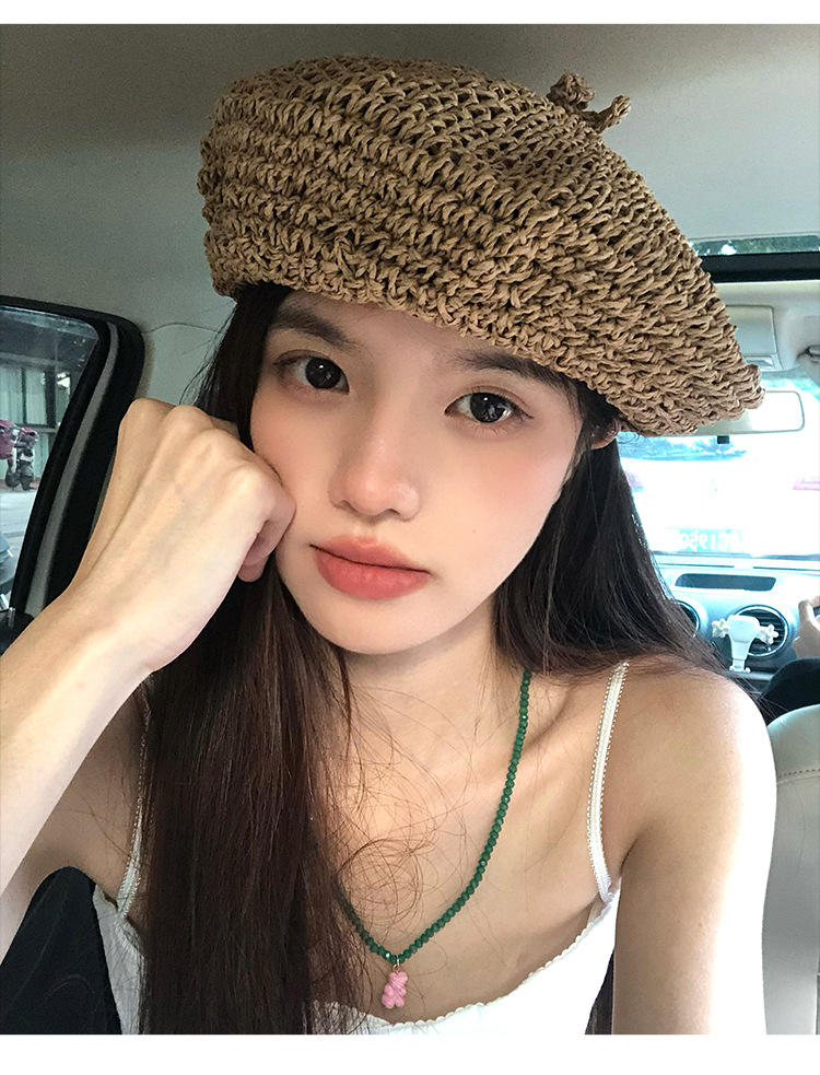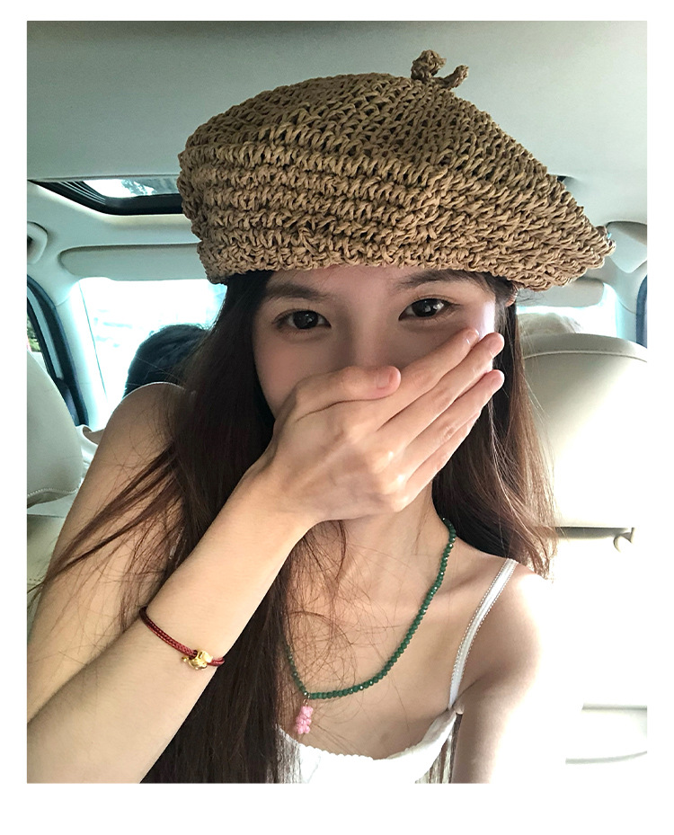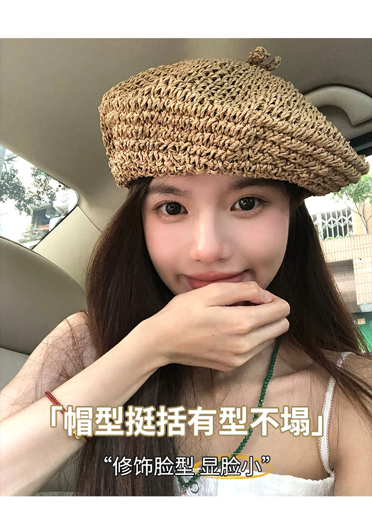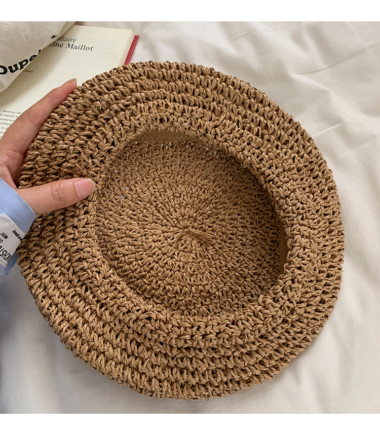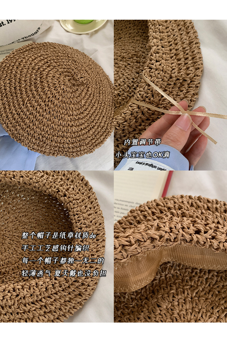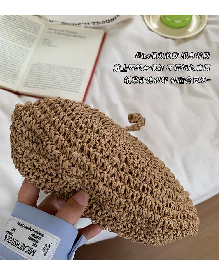 日本系のレトロな手作りのベレー帽の女性は夏に透かし彫りの大きい頭の周りに顔の小さい草を編んで画家の帽子を編みます。