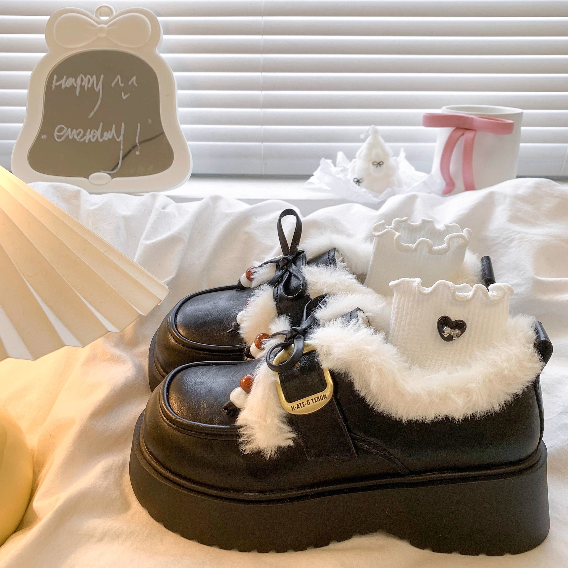 加绒蝴蝶结小皮鞋女款2025秋冬新款厚底保暖毛毛棉鞋英伦风乐福鞋