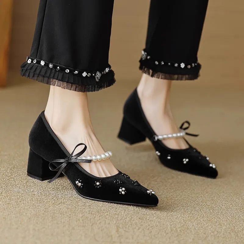 尖头粗跟单鞋女2025春夏新款法式名媛气质珍珠高跟百搭玛丽珍鞋女