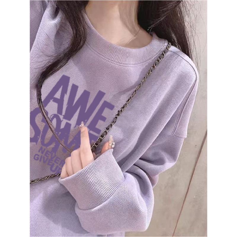 綿の丸首の薄い紫色の衛衣の女性の帽子がない2025春と秋にベルベットが厚くてゆったりしています。