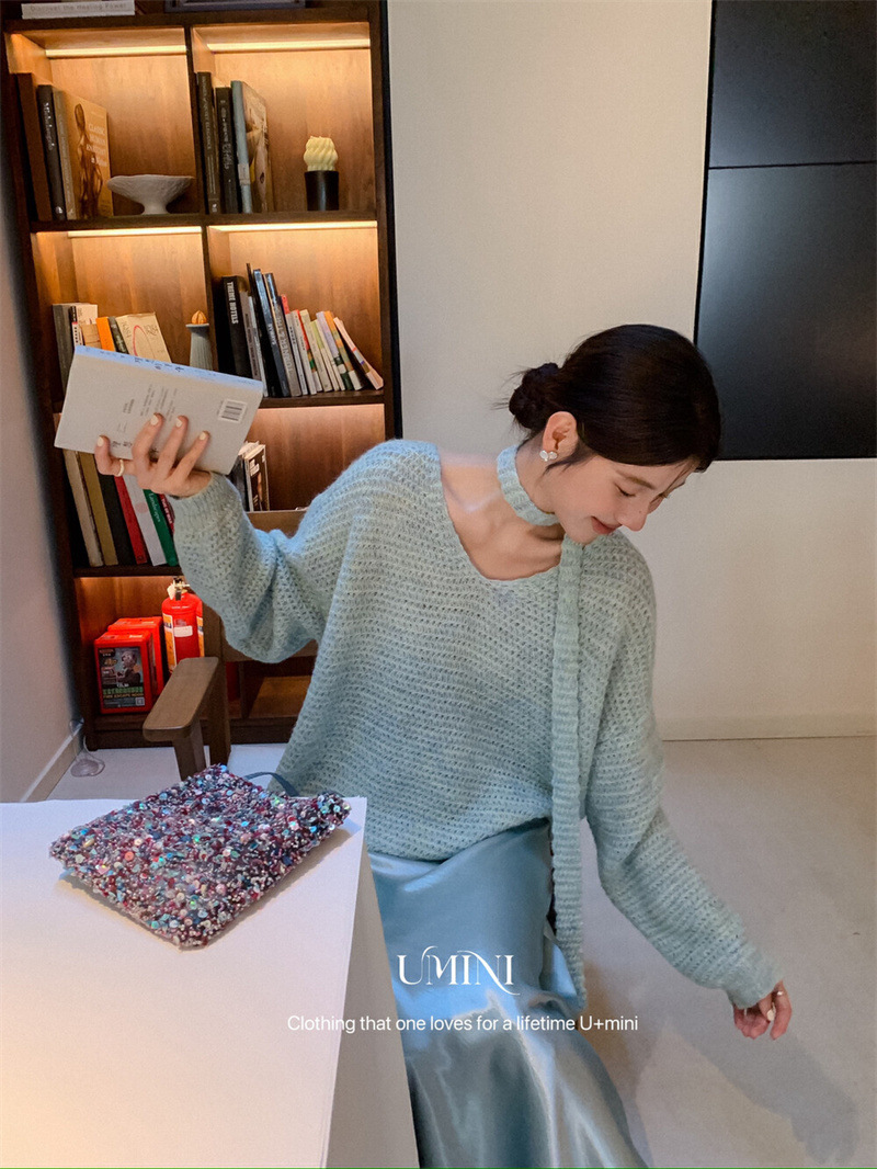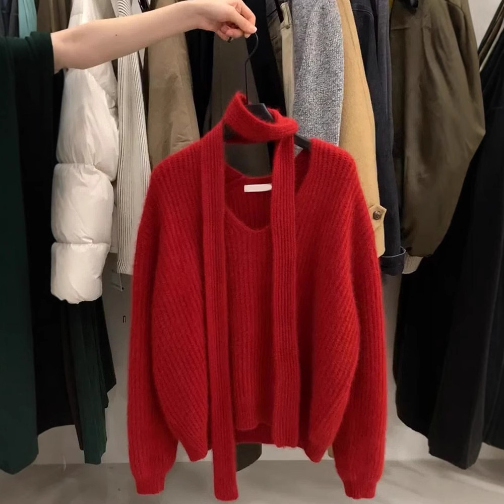 红茶系挂脖飘带v领套头毛衣女秋冬针织衫氛围感气质上衣带围巾