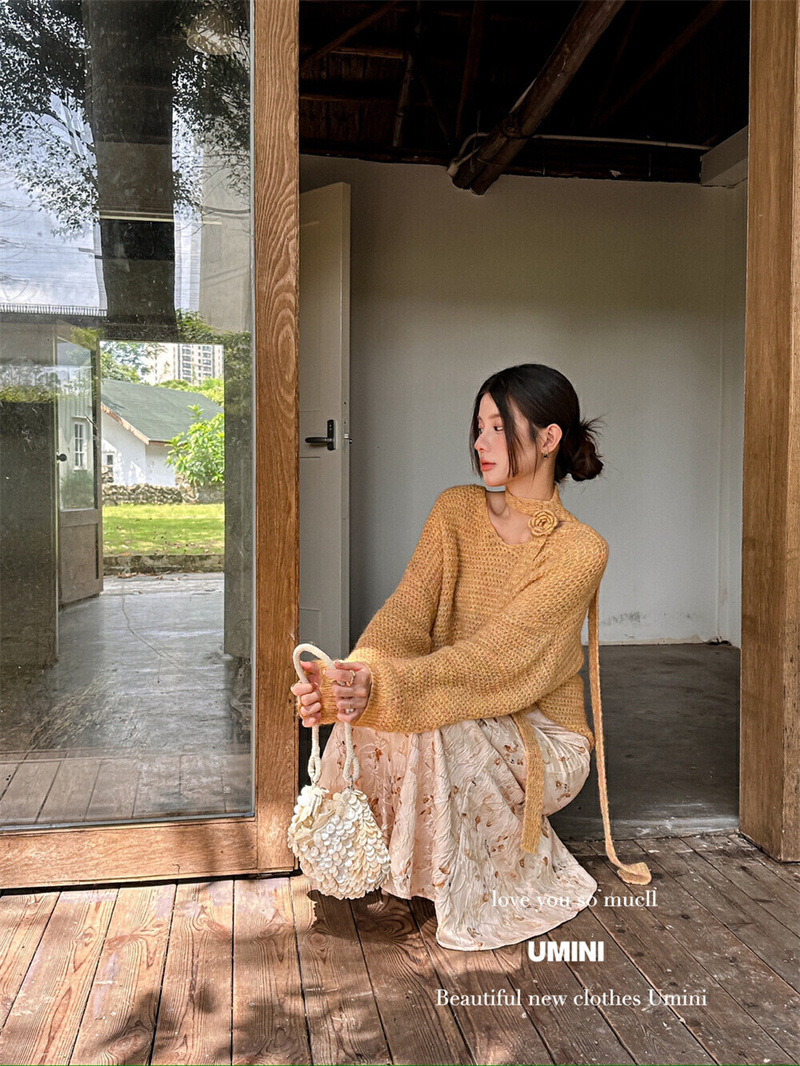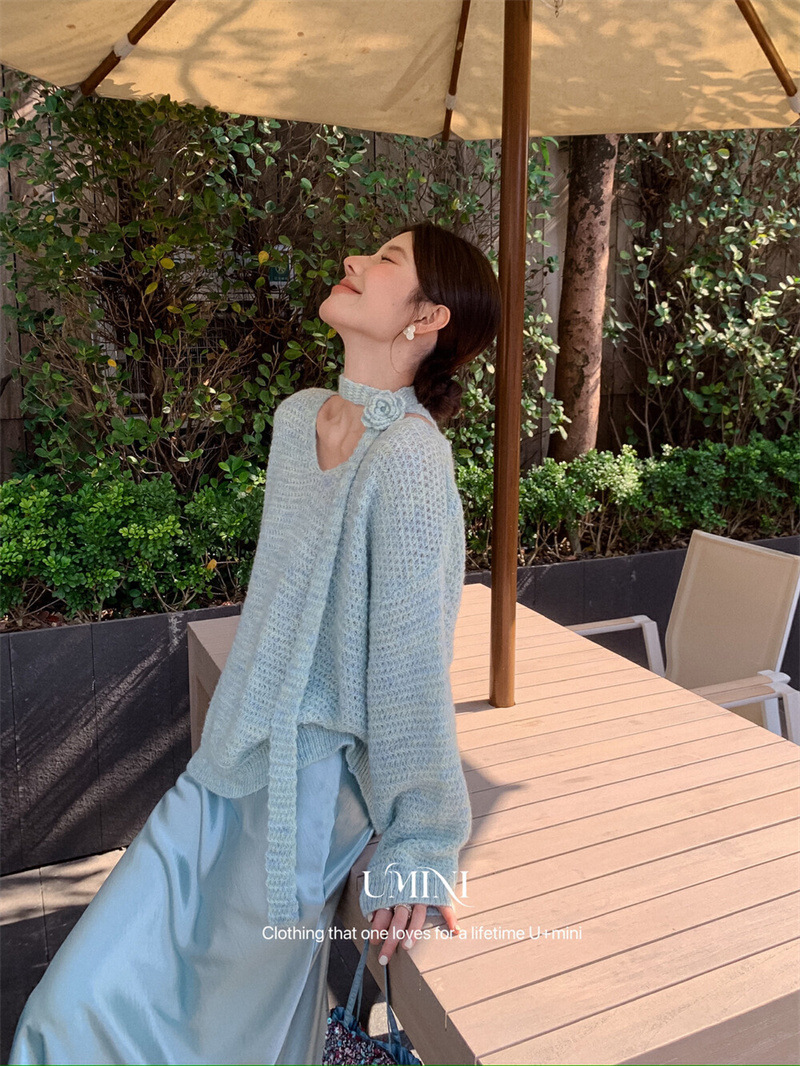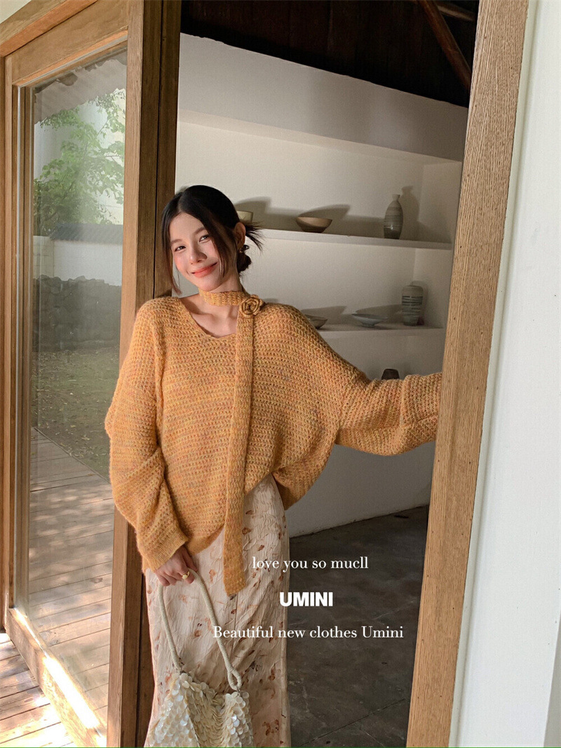 韩系黄色V领花朵飘带挂脖针织衫女早秋温柔风奶fufu软糯慵懒上衣