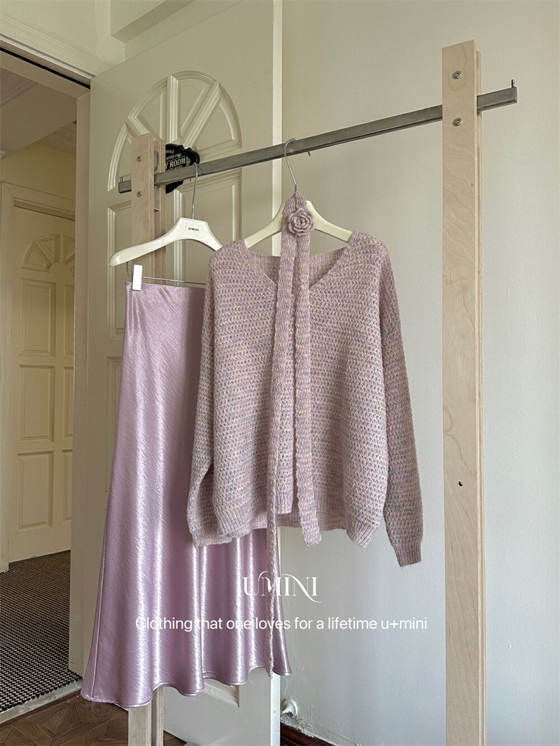 韩系春秋新款宽松慵懒风氛围感玫瑰花朵飘带V领针织衫显瘦毛衣女