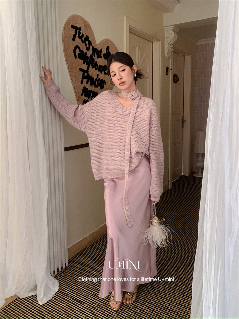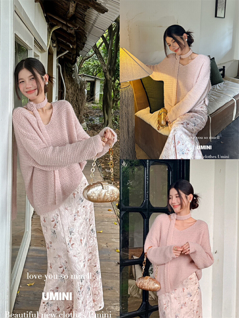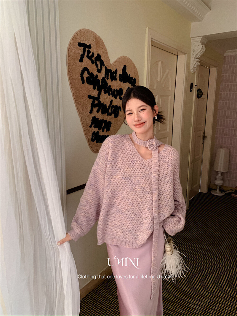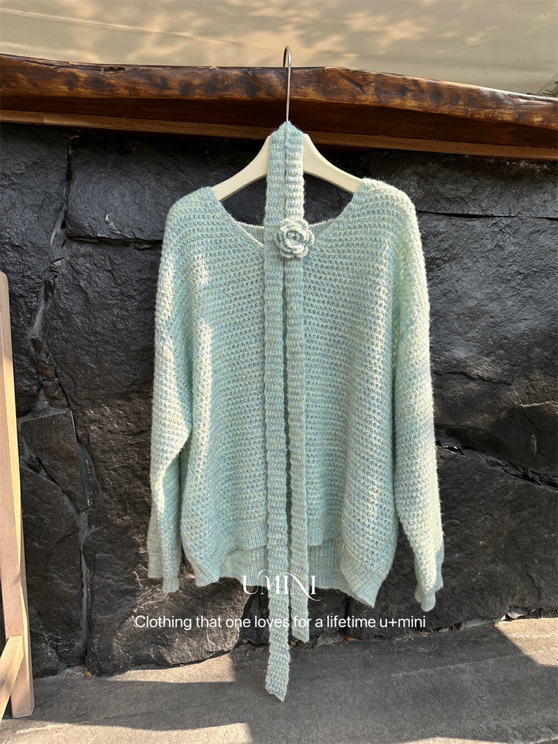 韩系宽松慵懒风秋季新款氛围感玫瑰花朵飘带V领针织衫显瘦毛衣女
