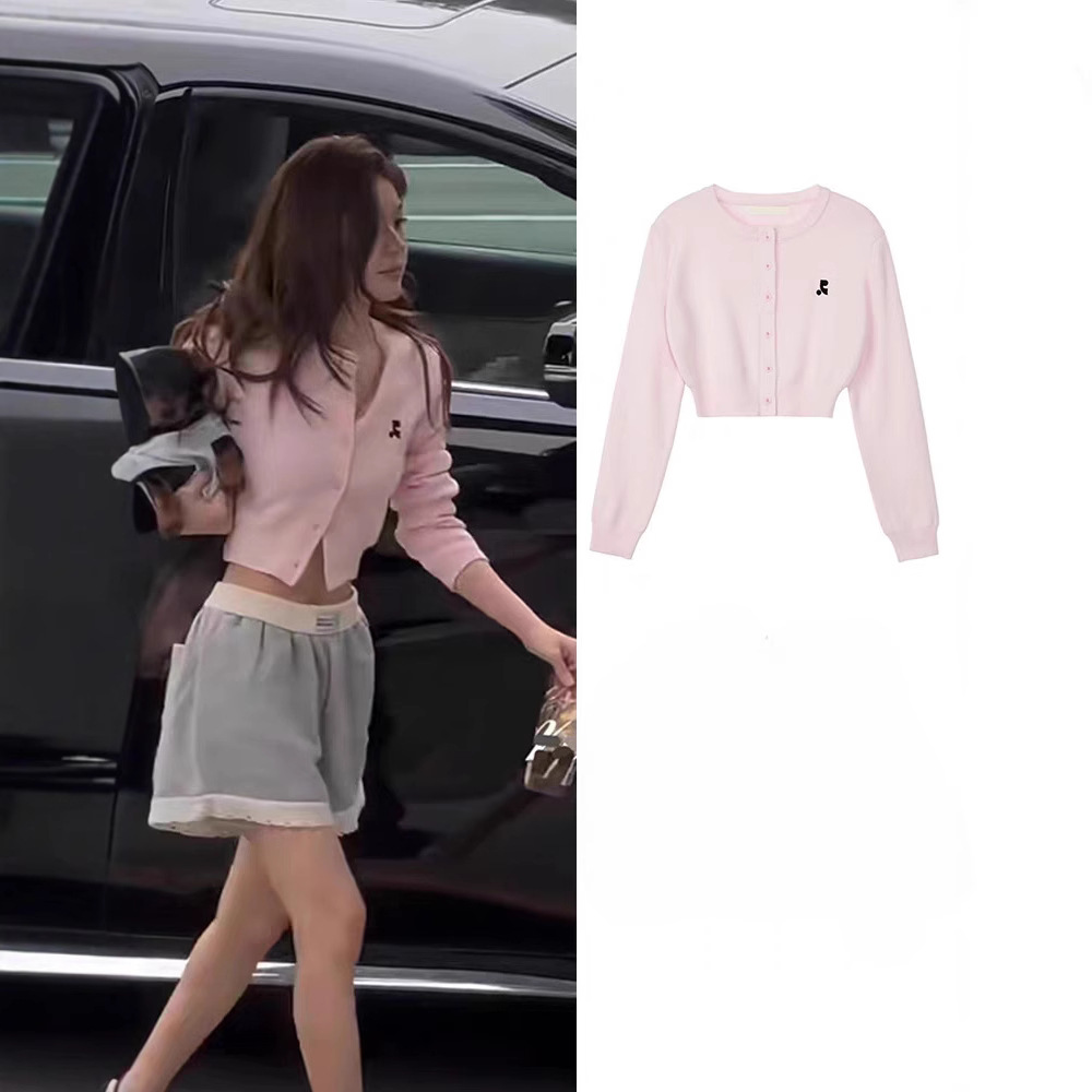2024年セレブ愛用ピンク長袖ニットカーディガン レディース RR刺繍入りラウンドネック スリムフィット セクシー丈丈ニット