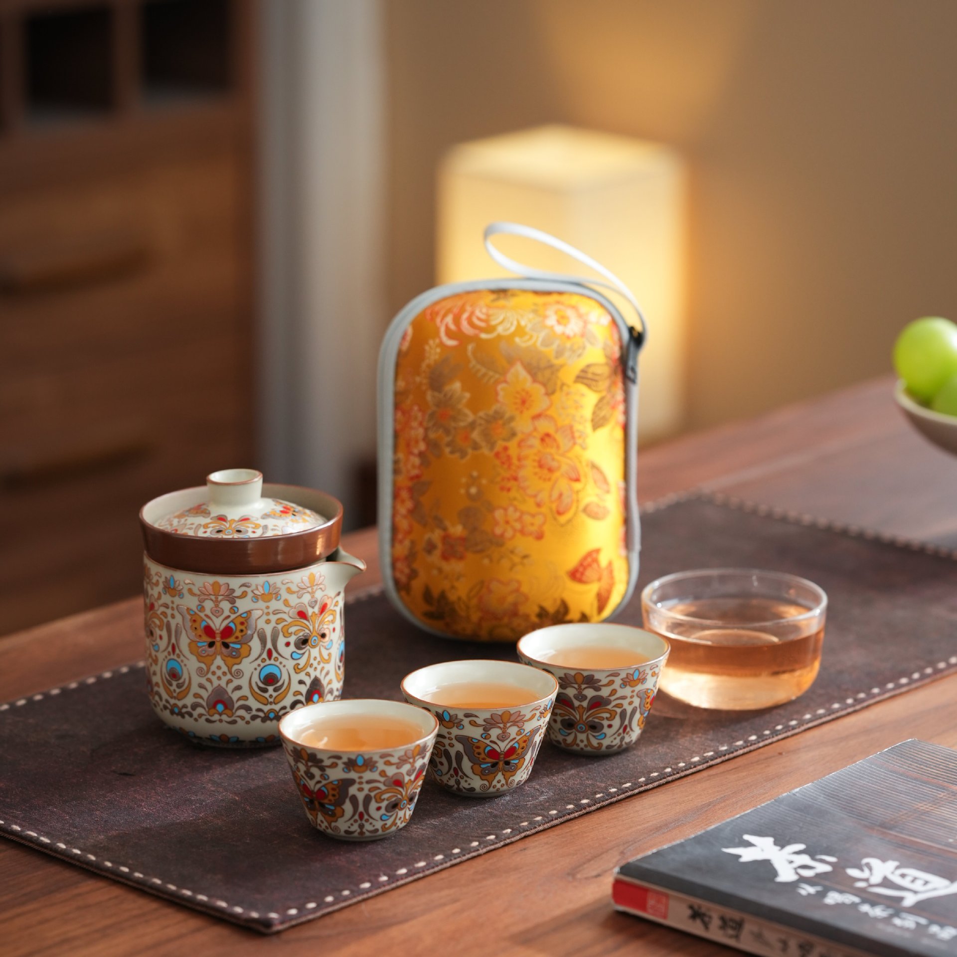 セラミックトラベルポータブルティーセット、ポット1つ、カップ4つ、キャンプアウトドア一人飲み、ロゴ入りビジネスコンパニオンギフト