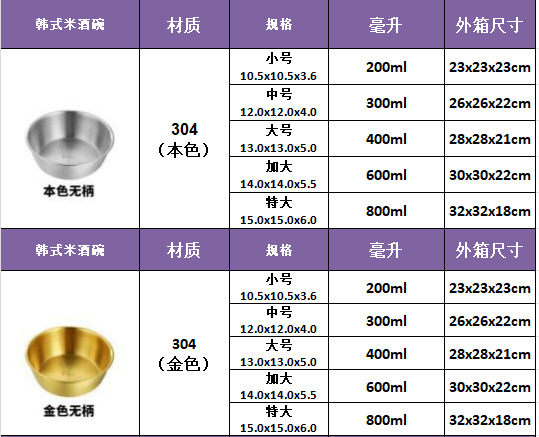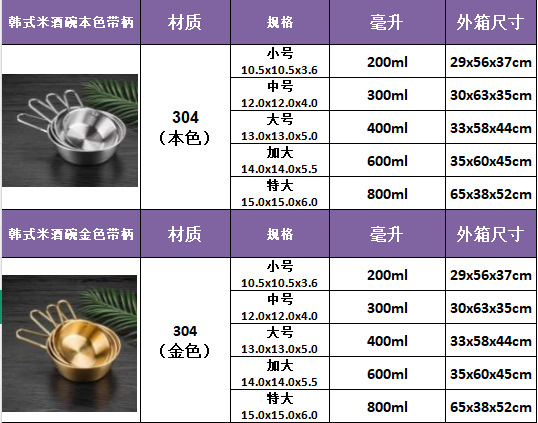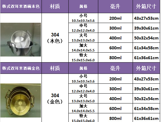SUS304(耳なしナチュラル色),SUS304(耳なしゴールド),SUS304(ナチュラル色ハンドル付),SUS304(ハンドル金色),SUS304(ナチュラル両耳),SUS304(金色の耳)