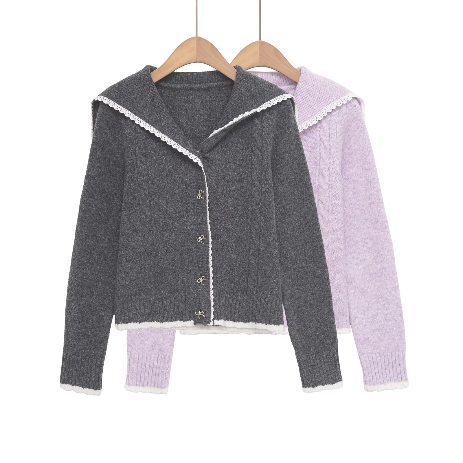 跨境外贸女装2025秋冬欧美风拼接蕾丝蝴蝶结纽扣针织开衫女C83994