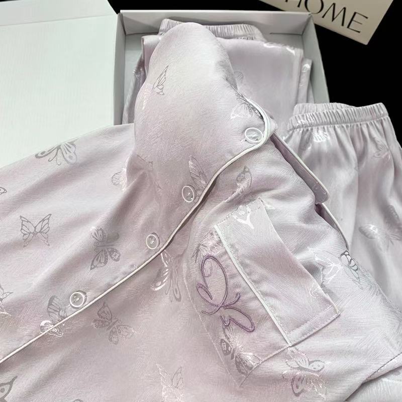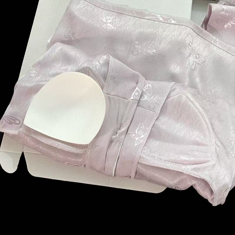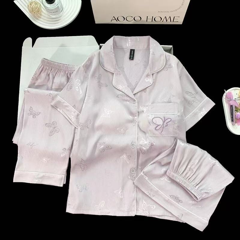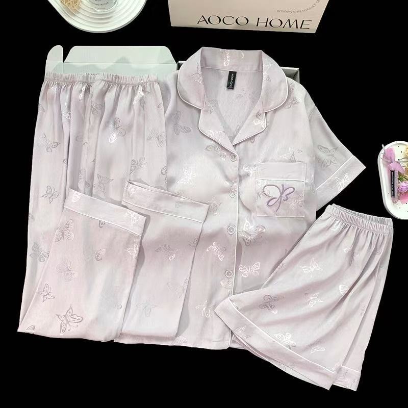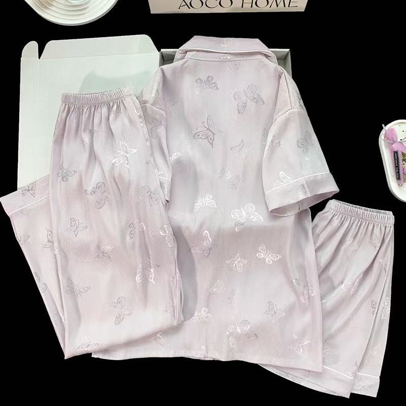 2025婦人パジャマ国風シルク半袖スーツ3点セット胸パッド付き夏カーディガン高級感