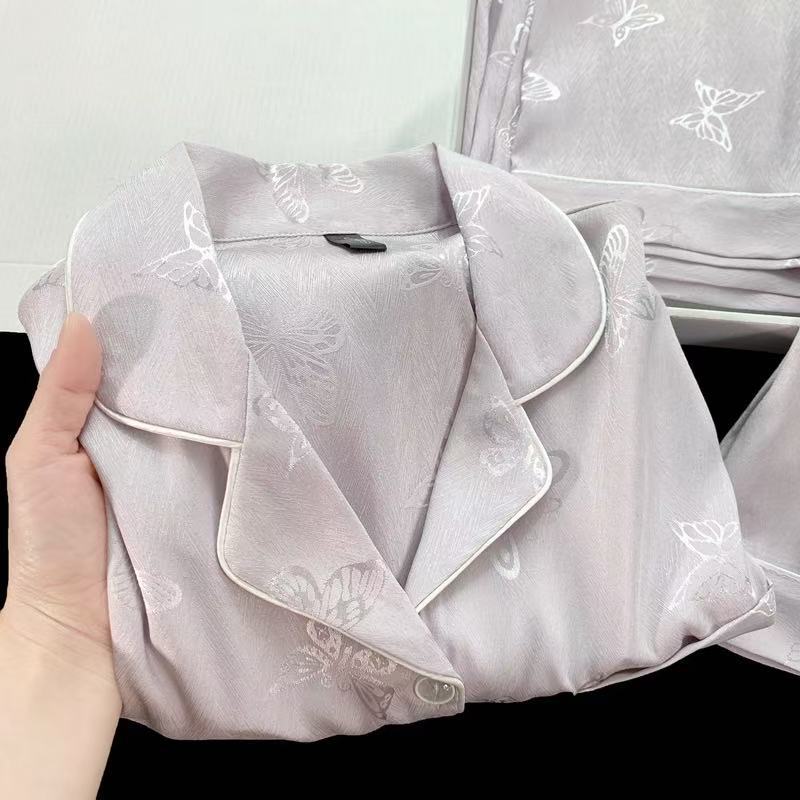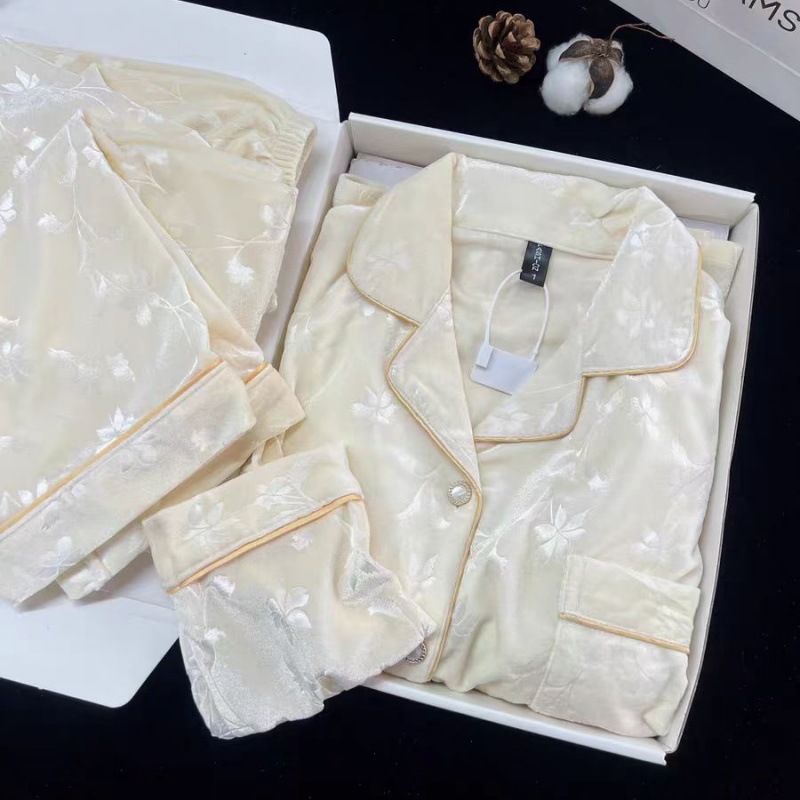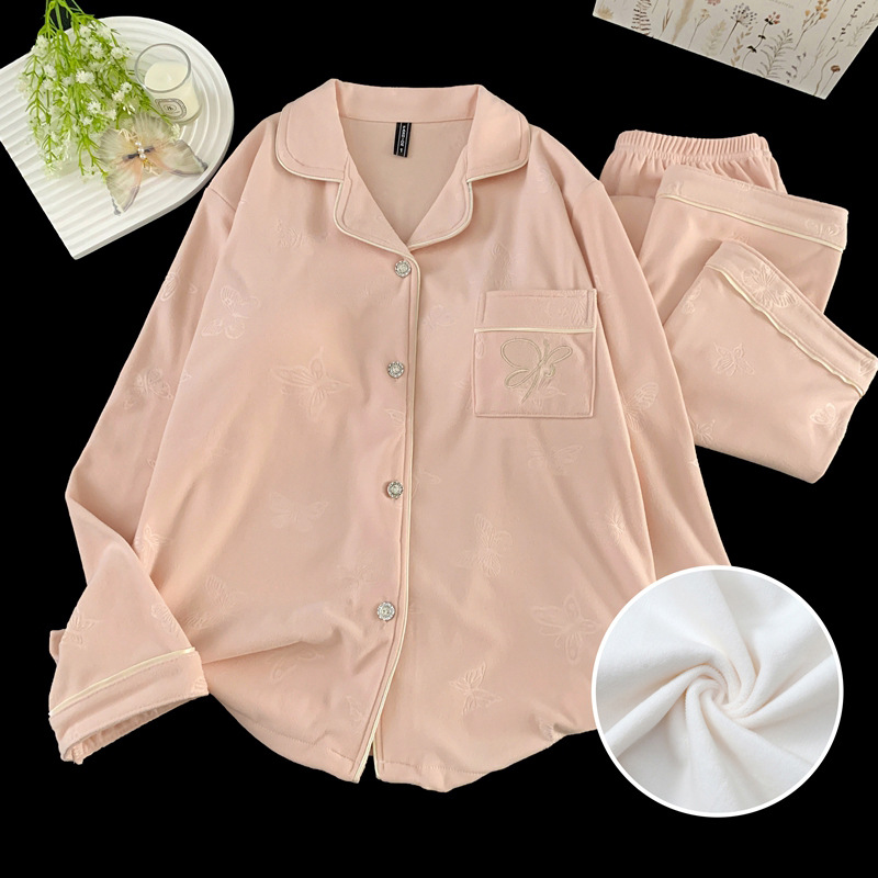 德绒压花蝴蝶结秋冬新款胸垫加厚高级感保暖睡衣女家居服两件套装