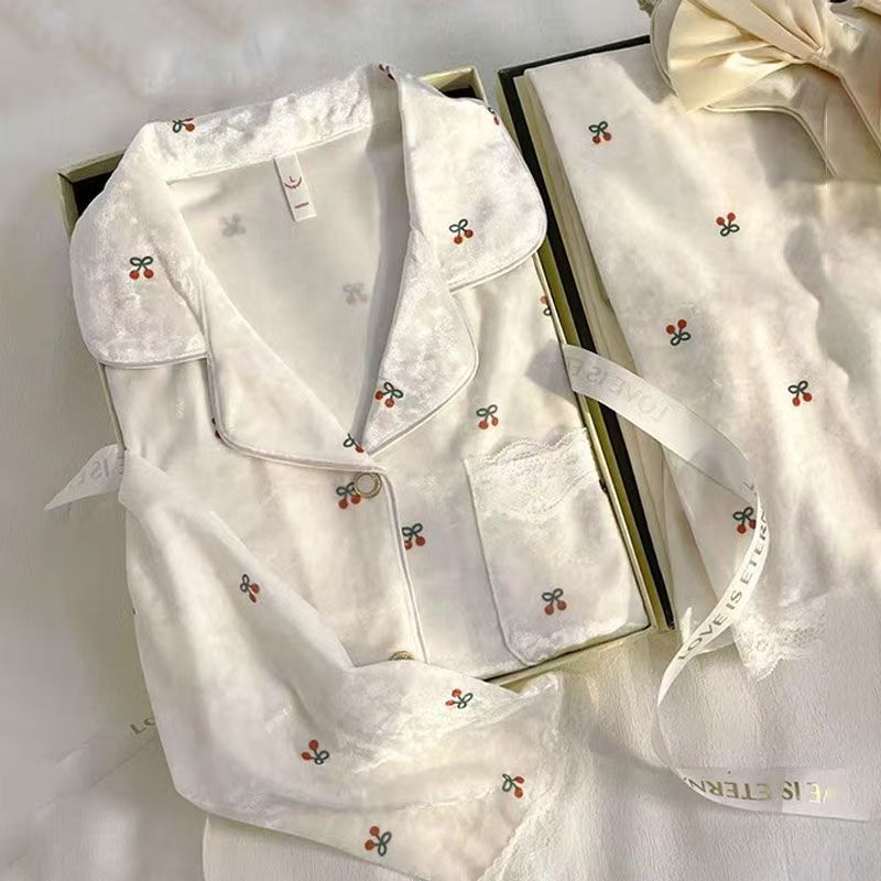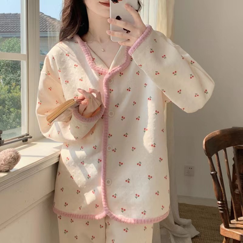 かわいいさくらんぼ空気綿サンドイッチ秋冬厚手パジャマ女2024新型長袖保温家庭服セット