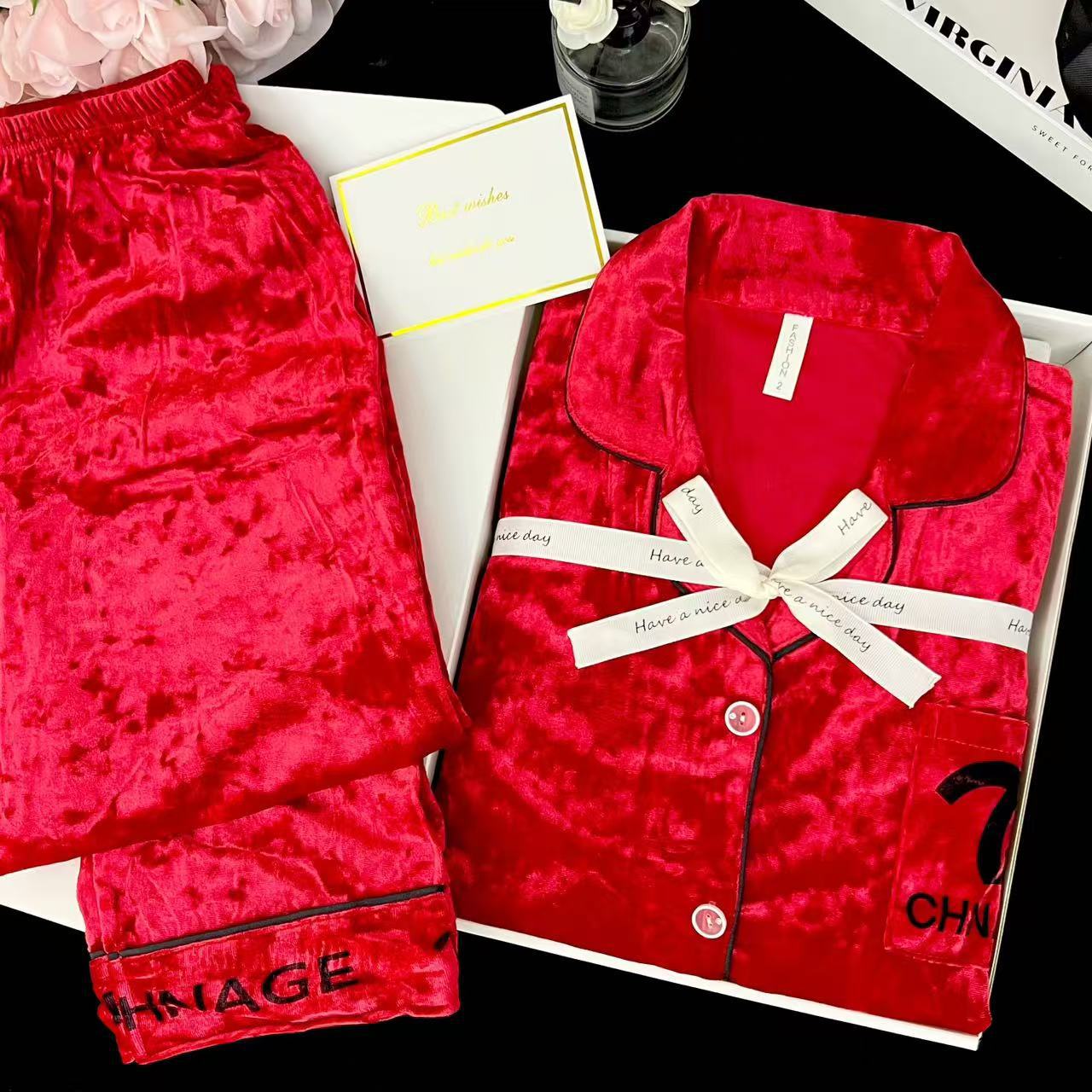 2024文字の軽い贅沢な小さな香りのベルベットのパジャマ女性秋冬の長袖の金ドリルのベルベットの家の服のスーツは生放送します