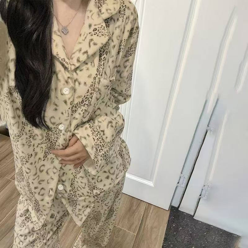高级感豹纹海岛绒睡衣女款2025新款秋冬季加绒保暖家居服开衫套装