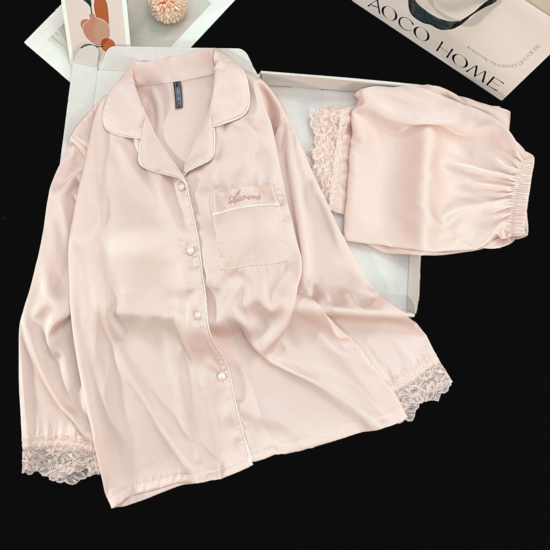 抖音爆款蕾丝长袖冰丝带胸垫睡衣女秋季带胸垫真丝家居服可外穿